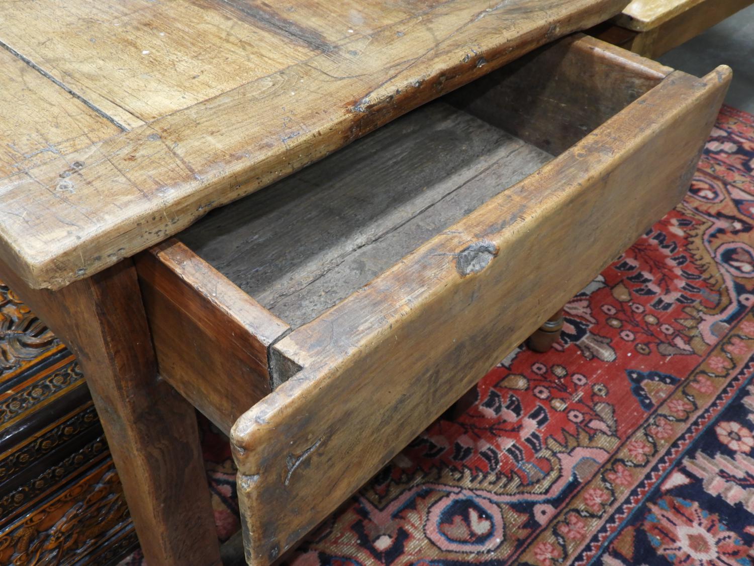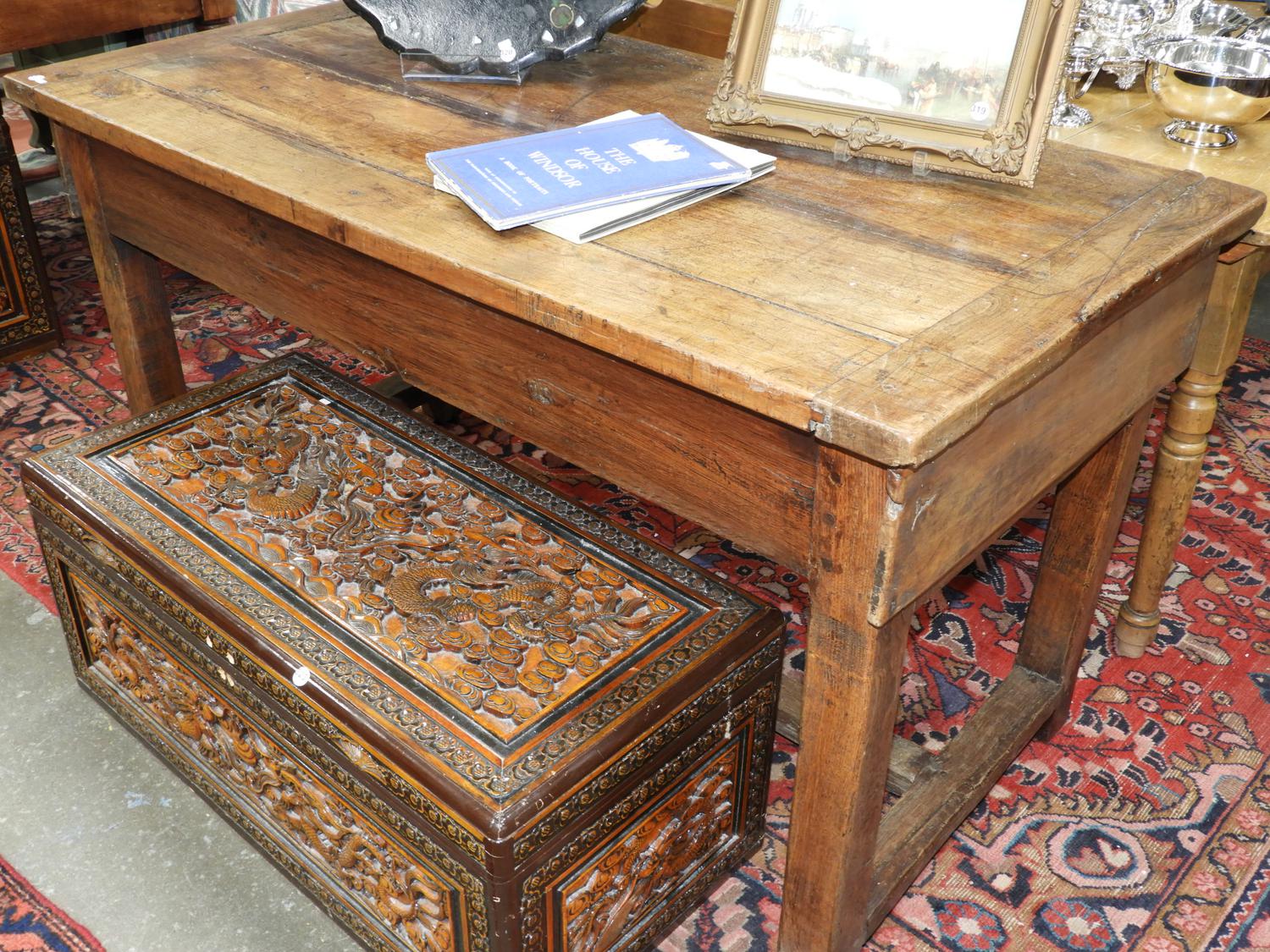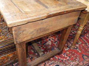 oak trestle base table with end drawers.