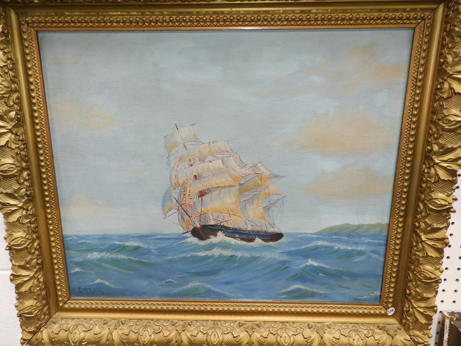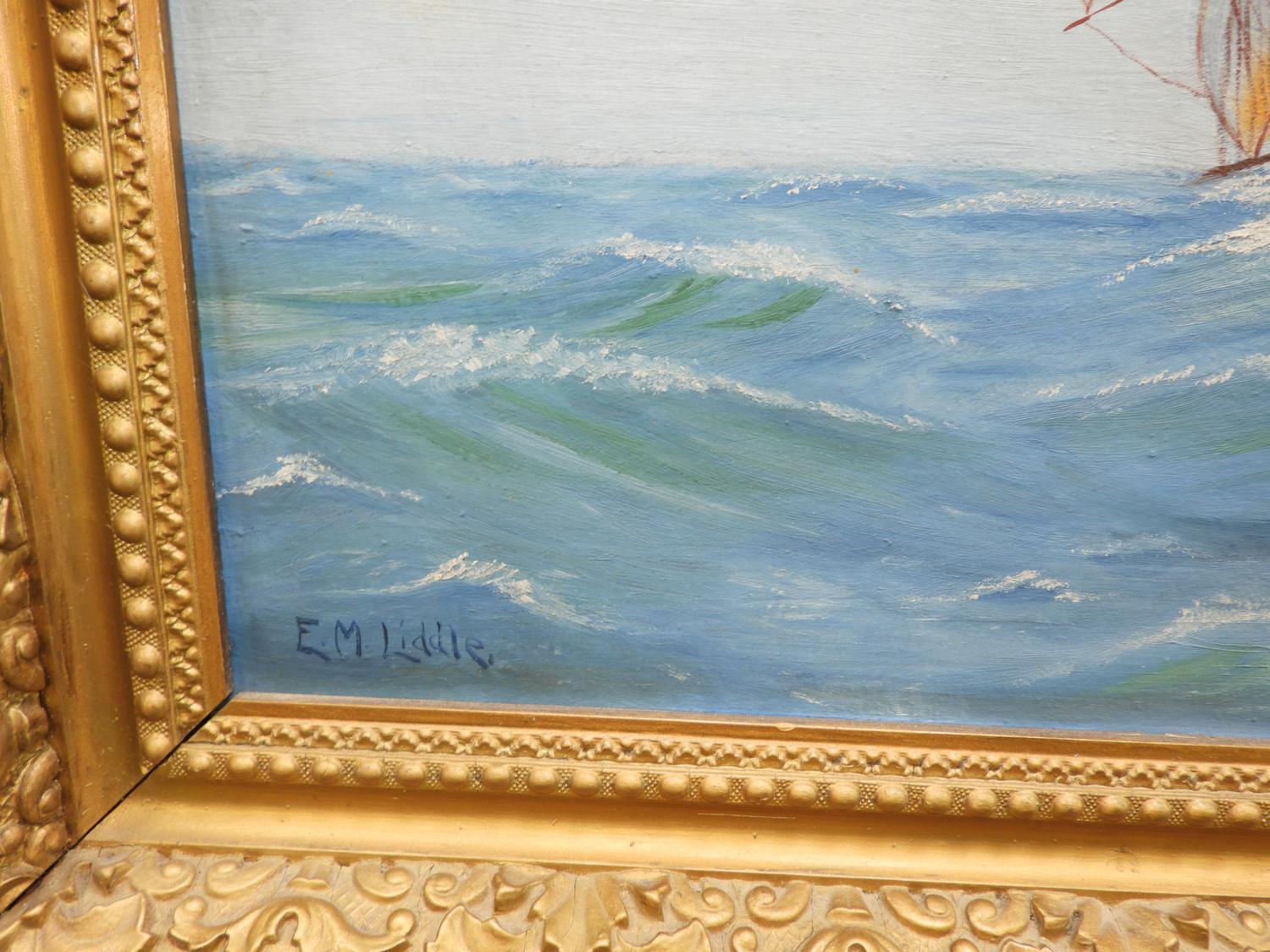 gilt framed pil painting signed e. m. liddle, 22" x 27", "tall ship in full sail".