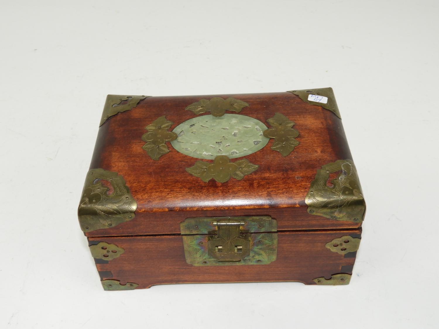 jewelery box with brass fittings and carved jade panel, ht. 4 1/4"