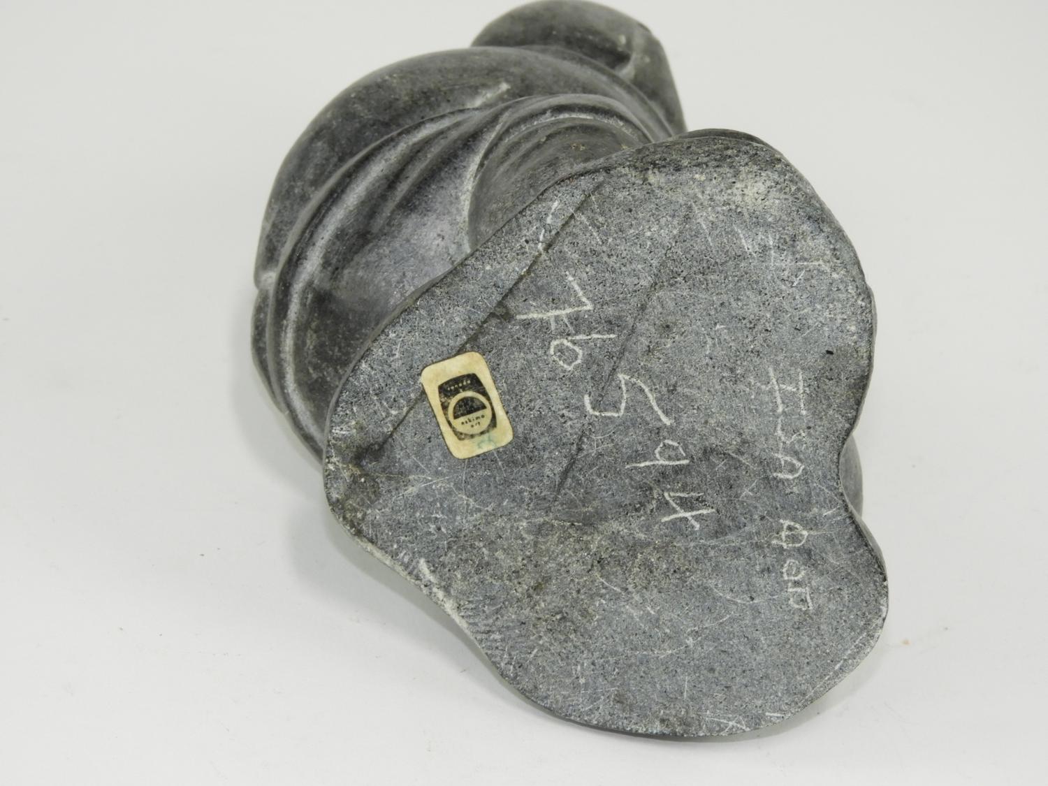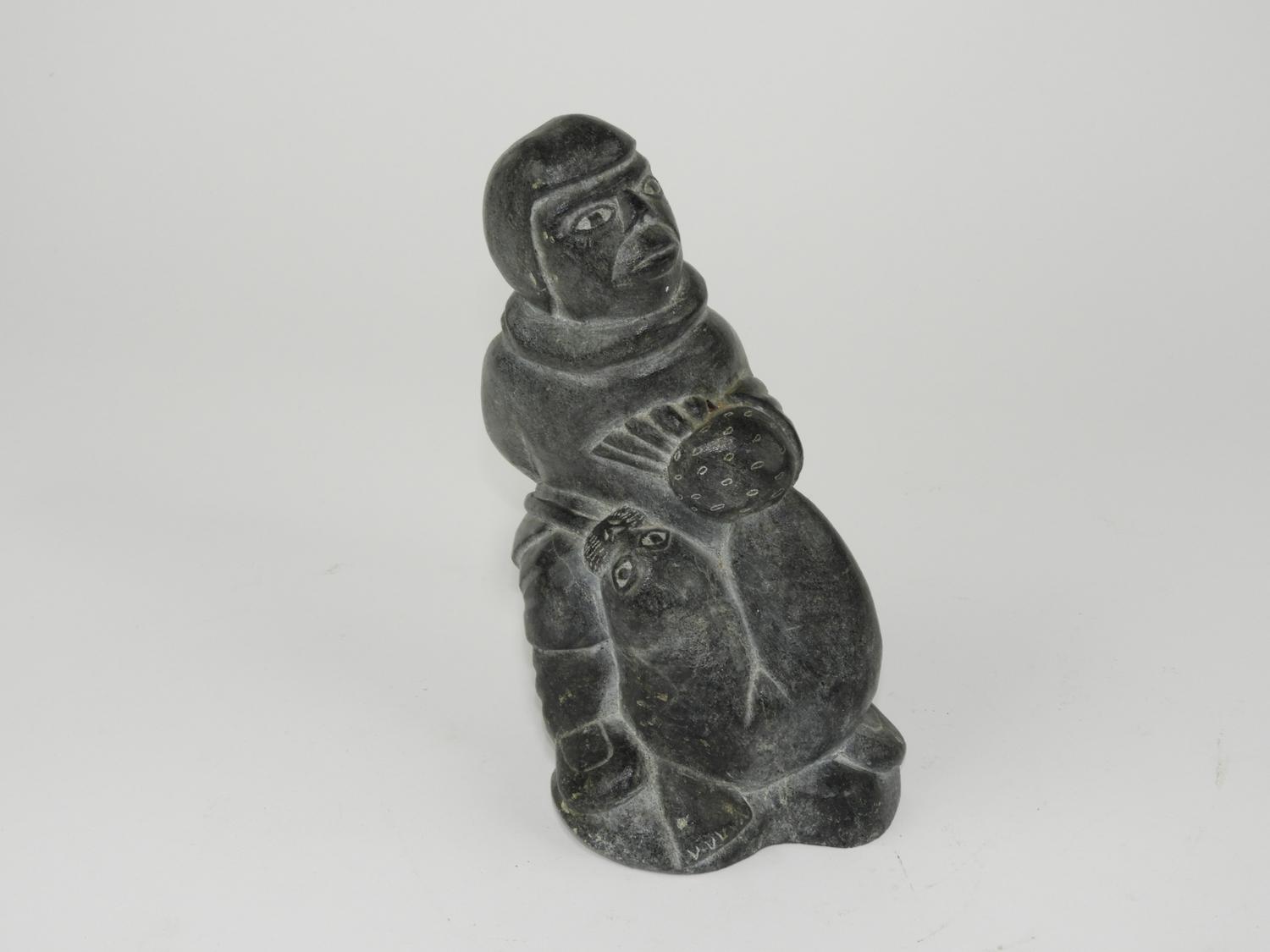 inuit carved grey stone figure of a hunter with seal, ht 8 1/2"