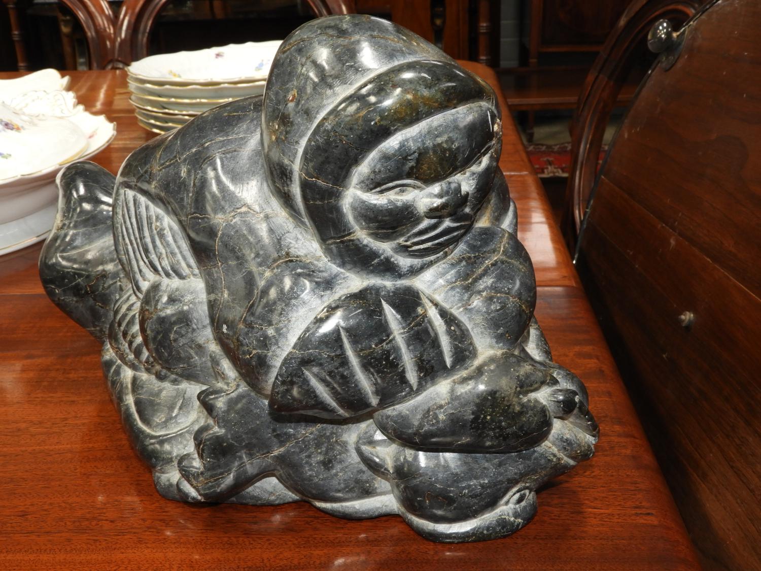 inuit carved stone figure of ahunter with seal, 9" x 15"