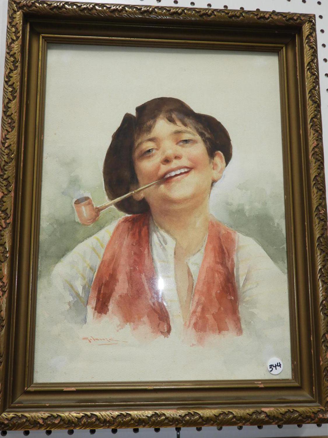 lanza giovanni, watercolour, 17" x 12 1/2", "young boy smoking pipe".