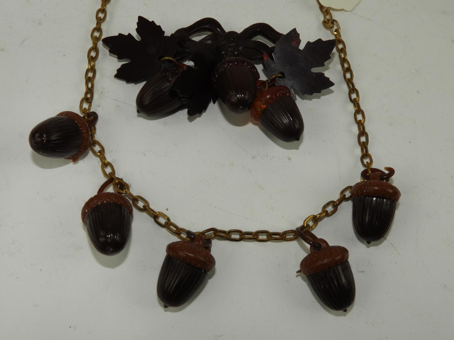 1930's celluloid acorn necklace and brooch.