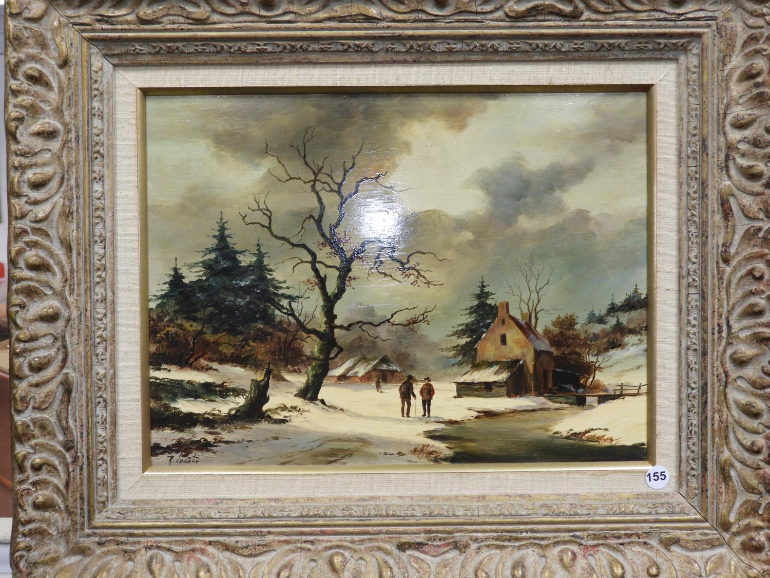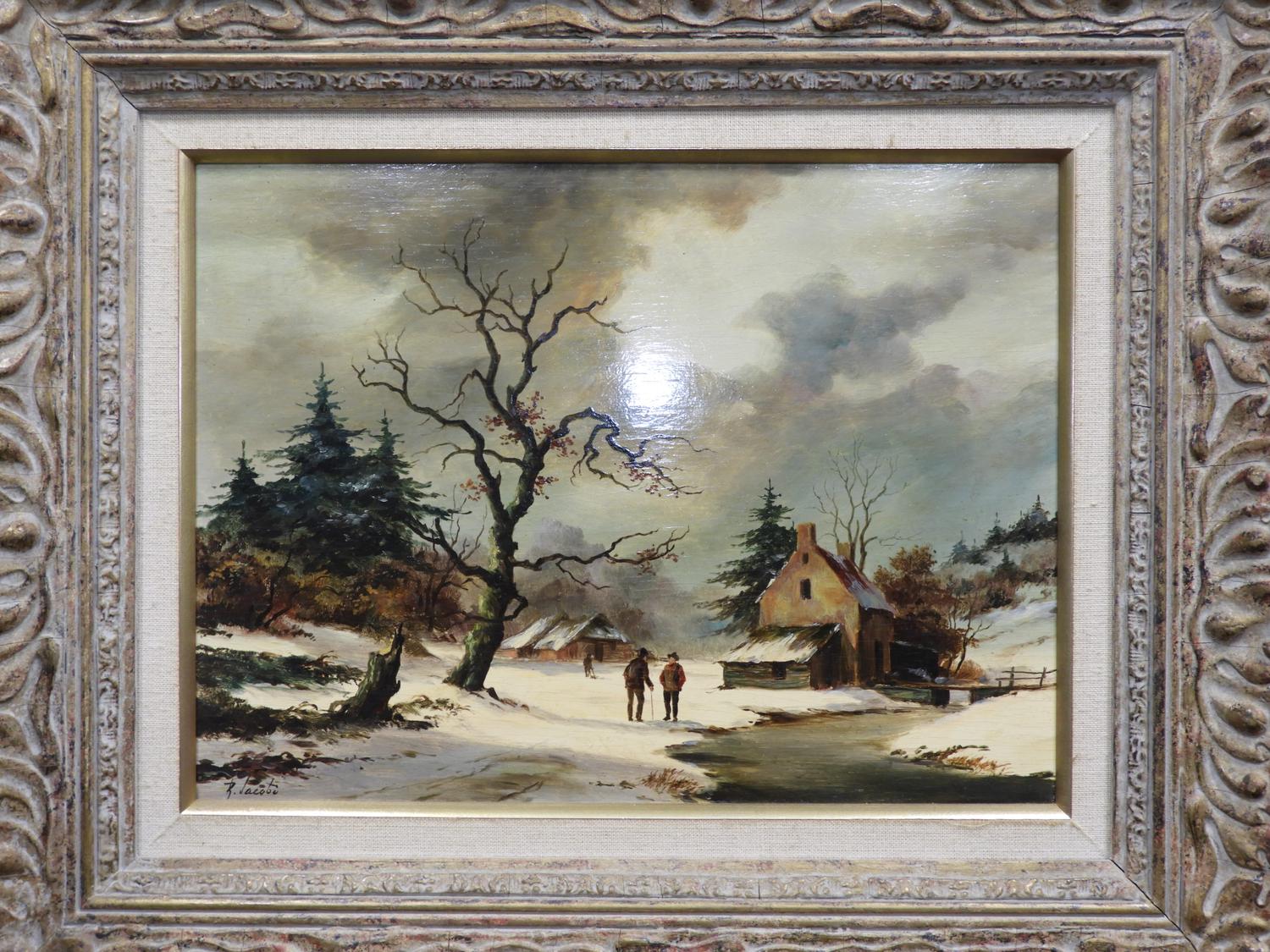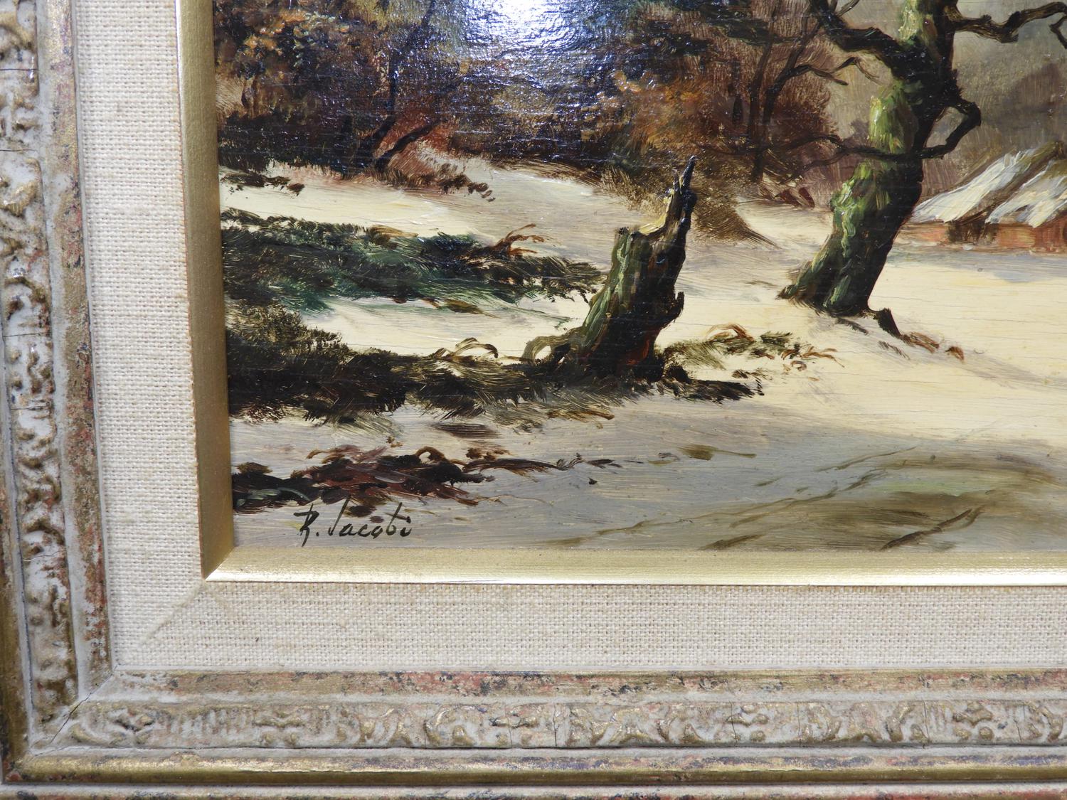 r. jacobi, oil on board, 12" x 16", "winter scene".