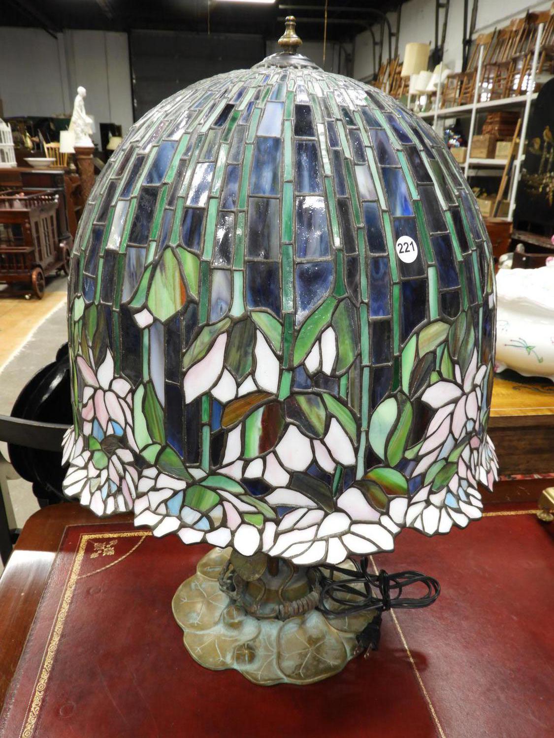 pair of tiffany style table lamps with coloured leaded glass shades.