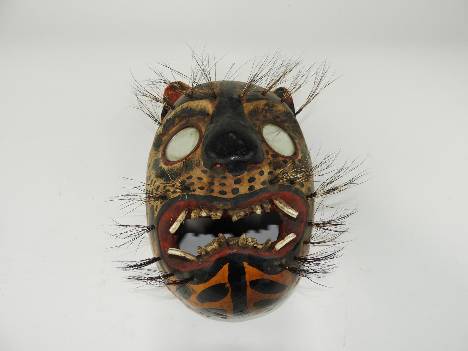 carved and painted leopard mask with inset teeth, ht. 12 1/2"