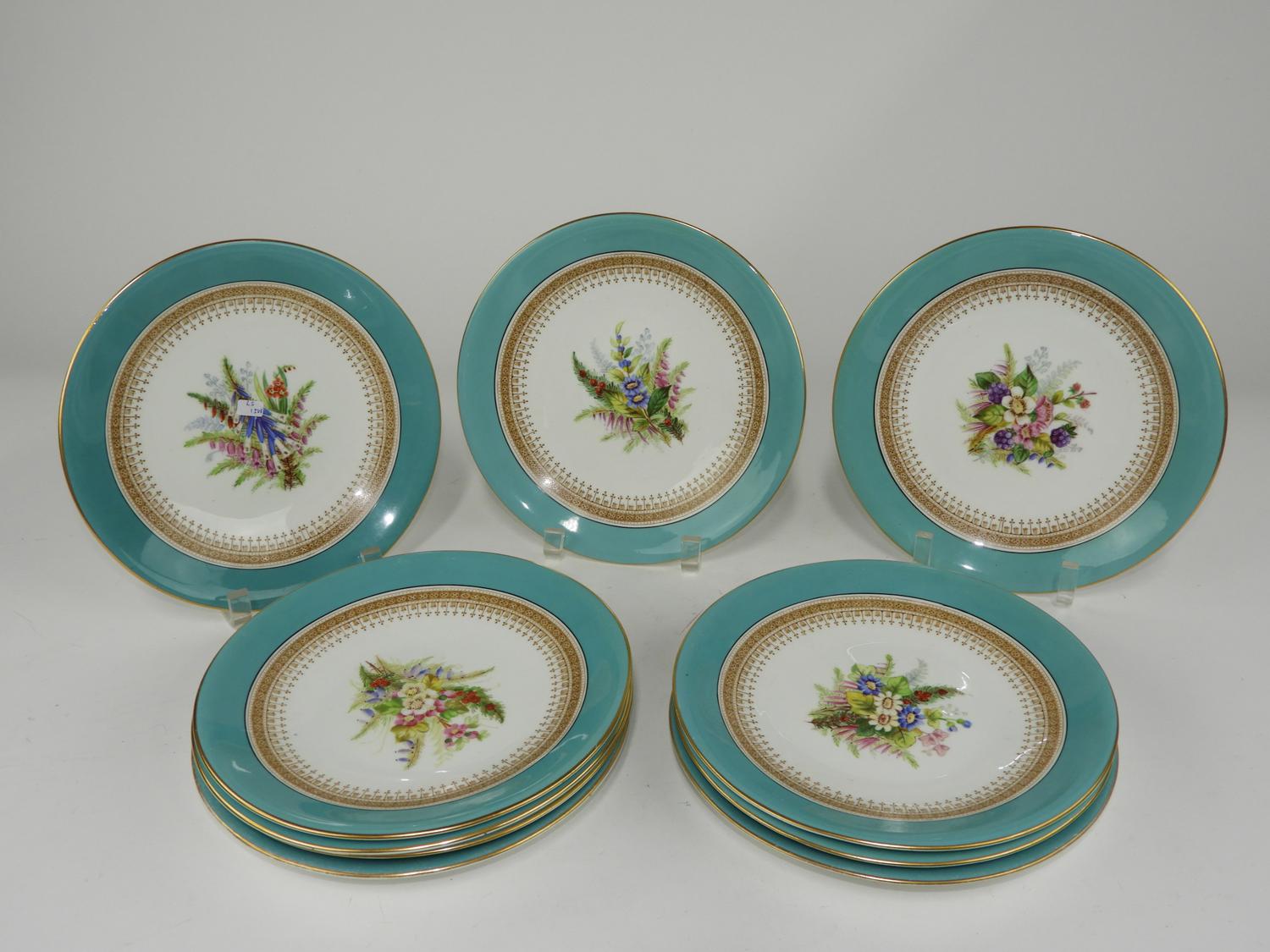 royal worchester floral painted turquoise rim fruit plates with gilt trim