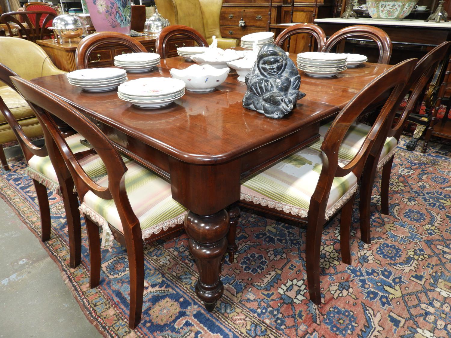 19th century key wind dining table with extension lens and eight chairs