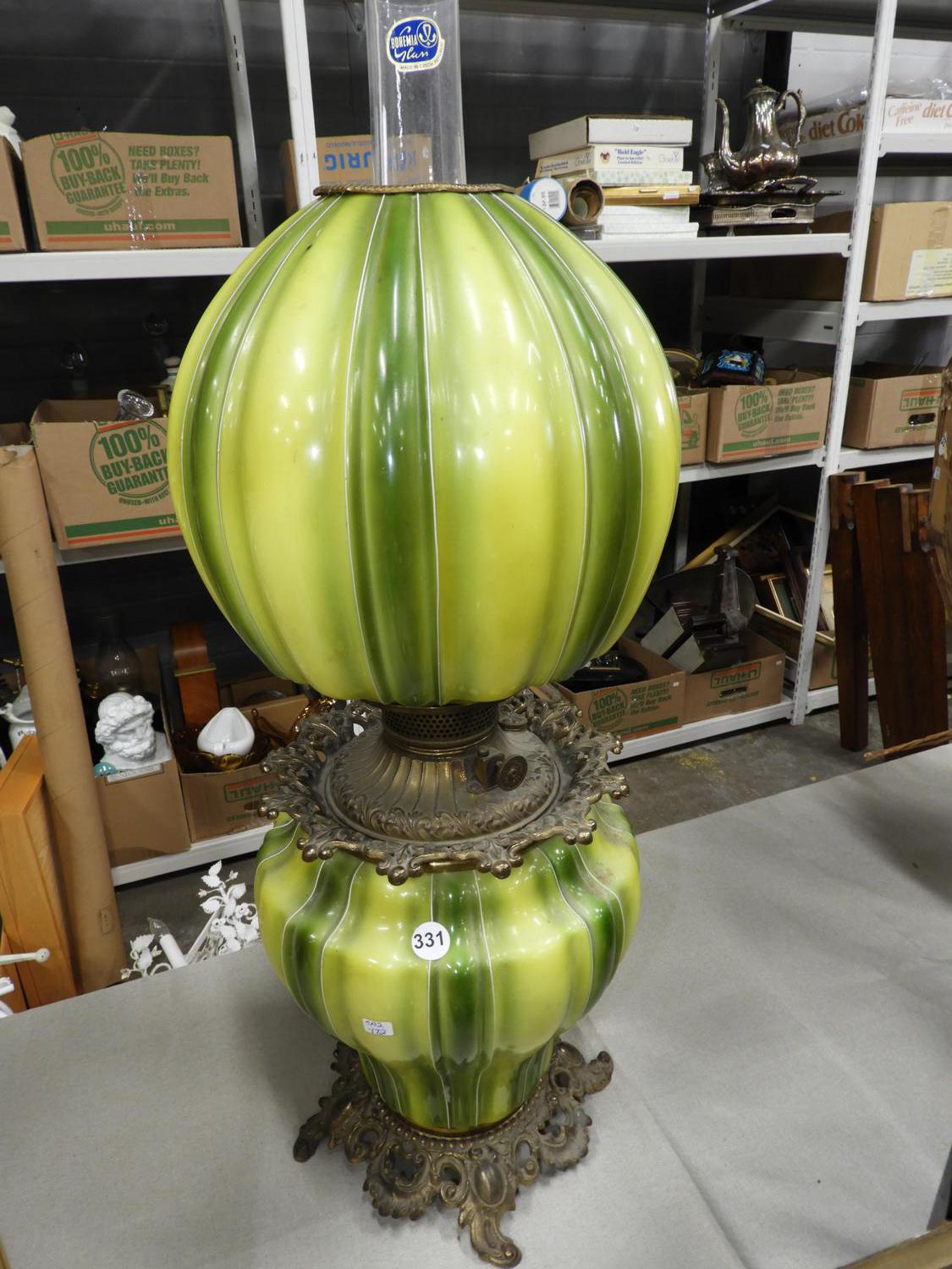 gilt metal fluid lamp with green glass base and shade, ht. 28".