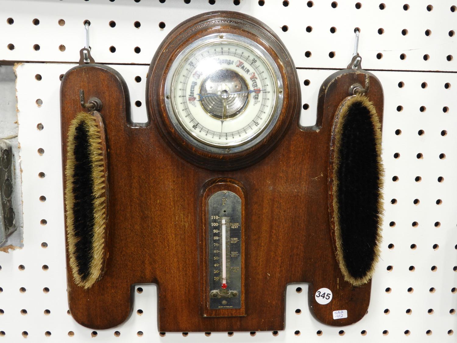 english wall barometer/thermometer mounted on plaque wiht clothes brushes