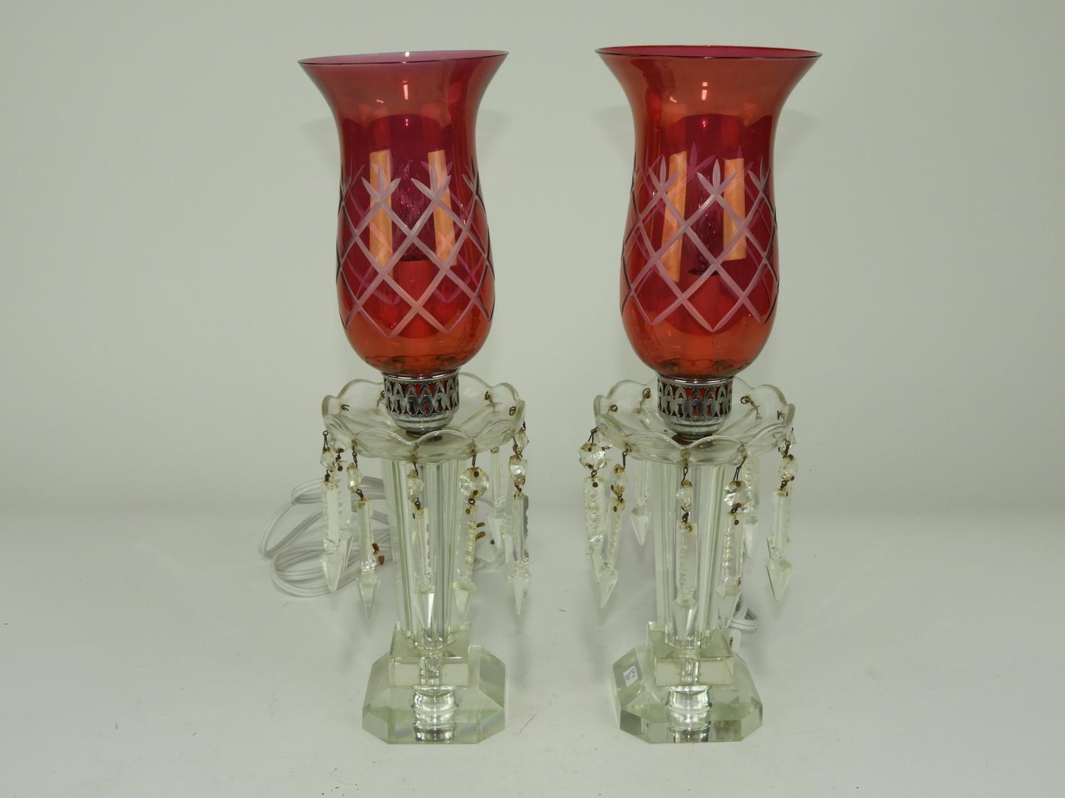 pair of cranberry glass lustres