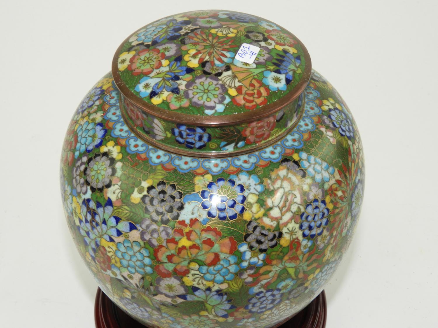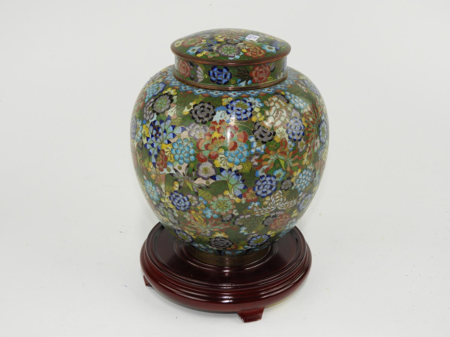 chinese cloisonee enamel covered jar on stand, ht. 10"