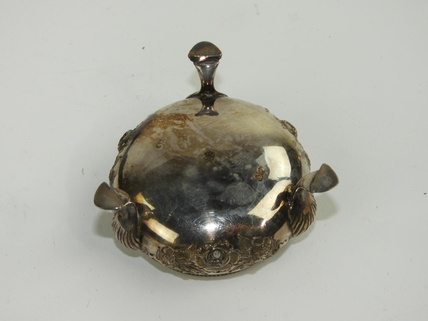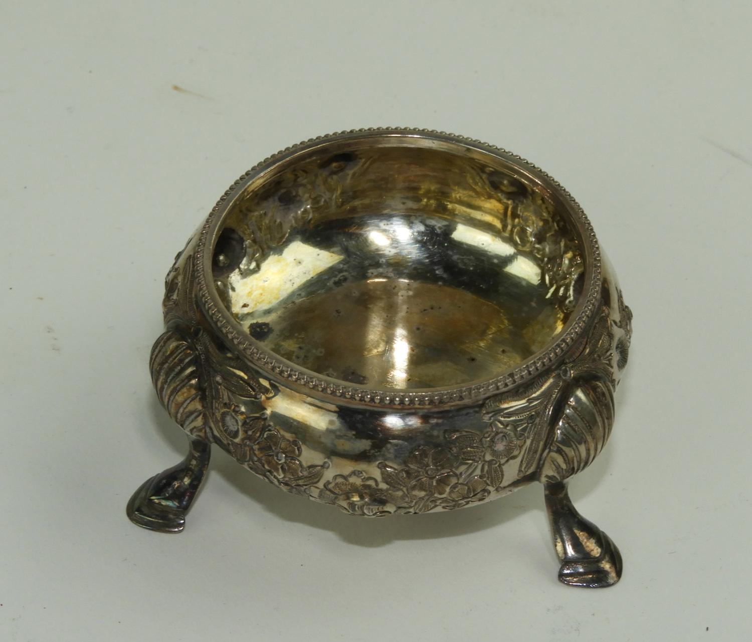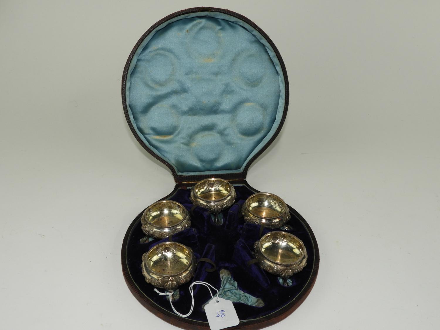 victorian leather cased set of footed open salts, london, 1883, marked e. h.