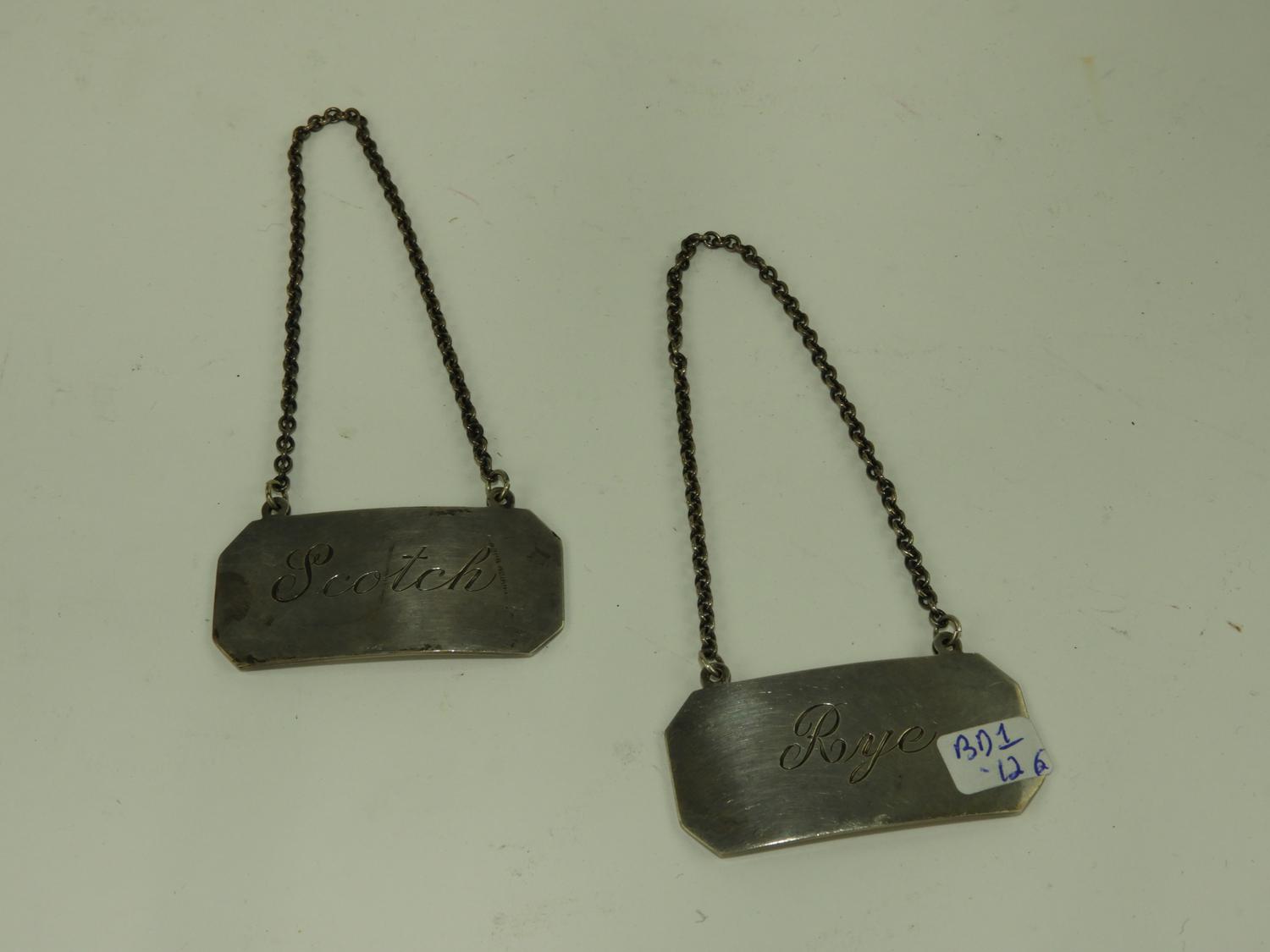 two birks sterling silver bottle tickets, "rye" & "scotch"