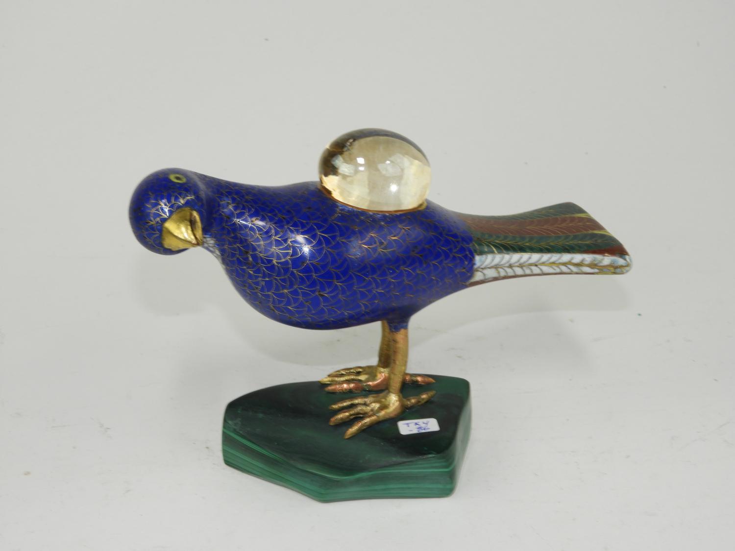 cloisonne enamel bird on a malachite stand, 6" x 8"