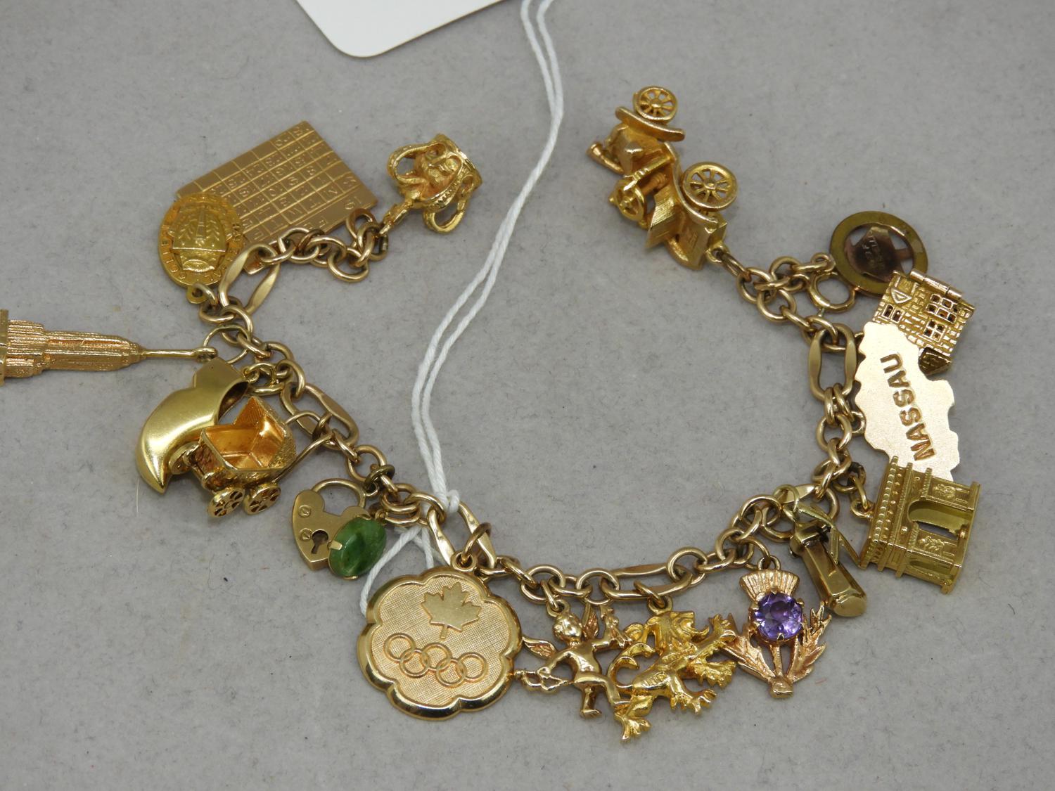 10k pink gold charm bracelet with 9/1014k charms, weighing approx 46grams"