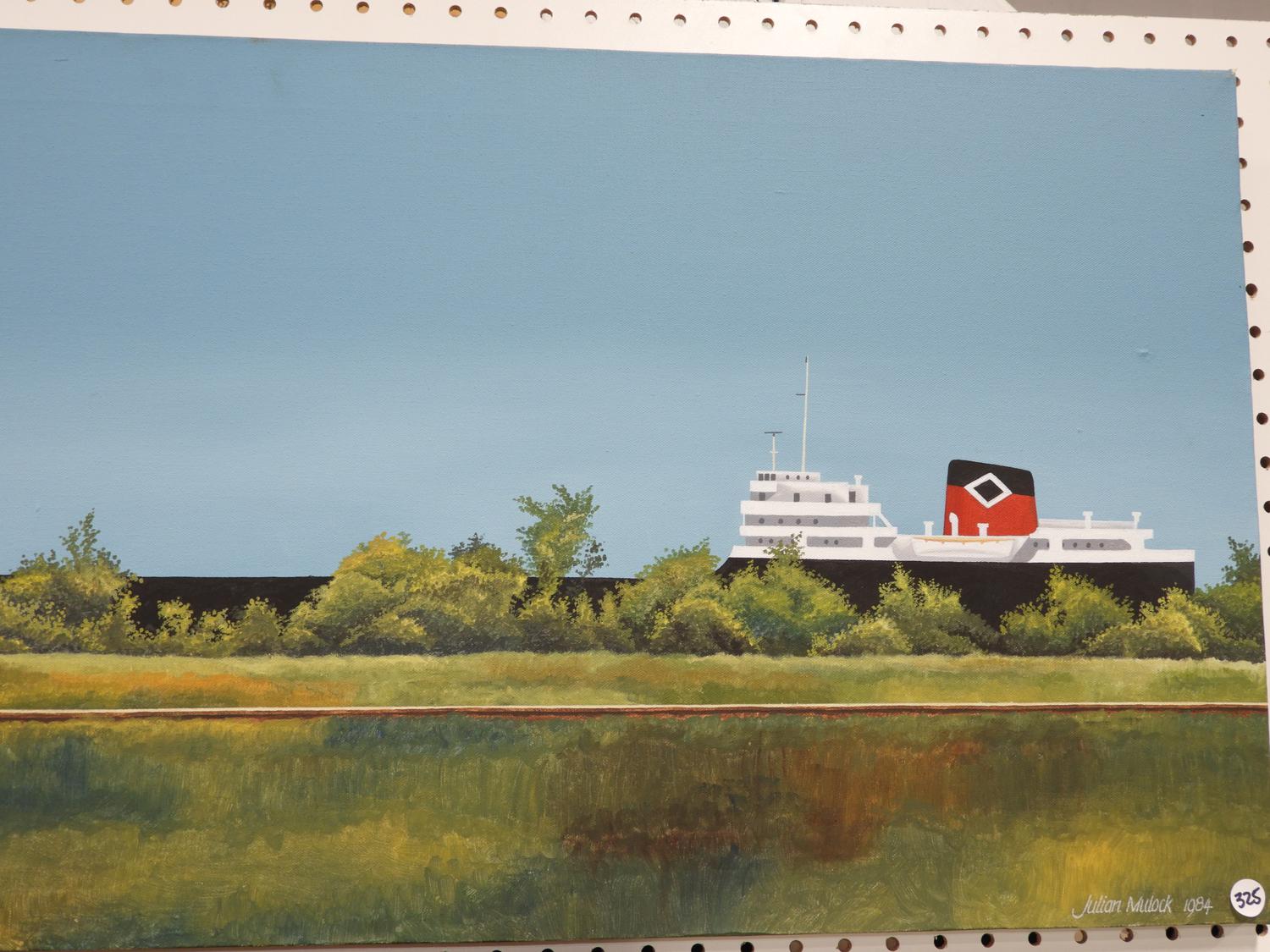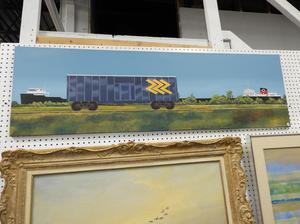 julian mulock, d.1984, acrylic on canvas, 18" x 60", "steam liner and rail car".
