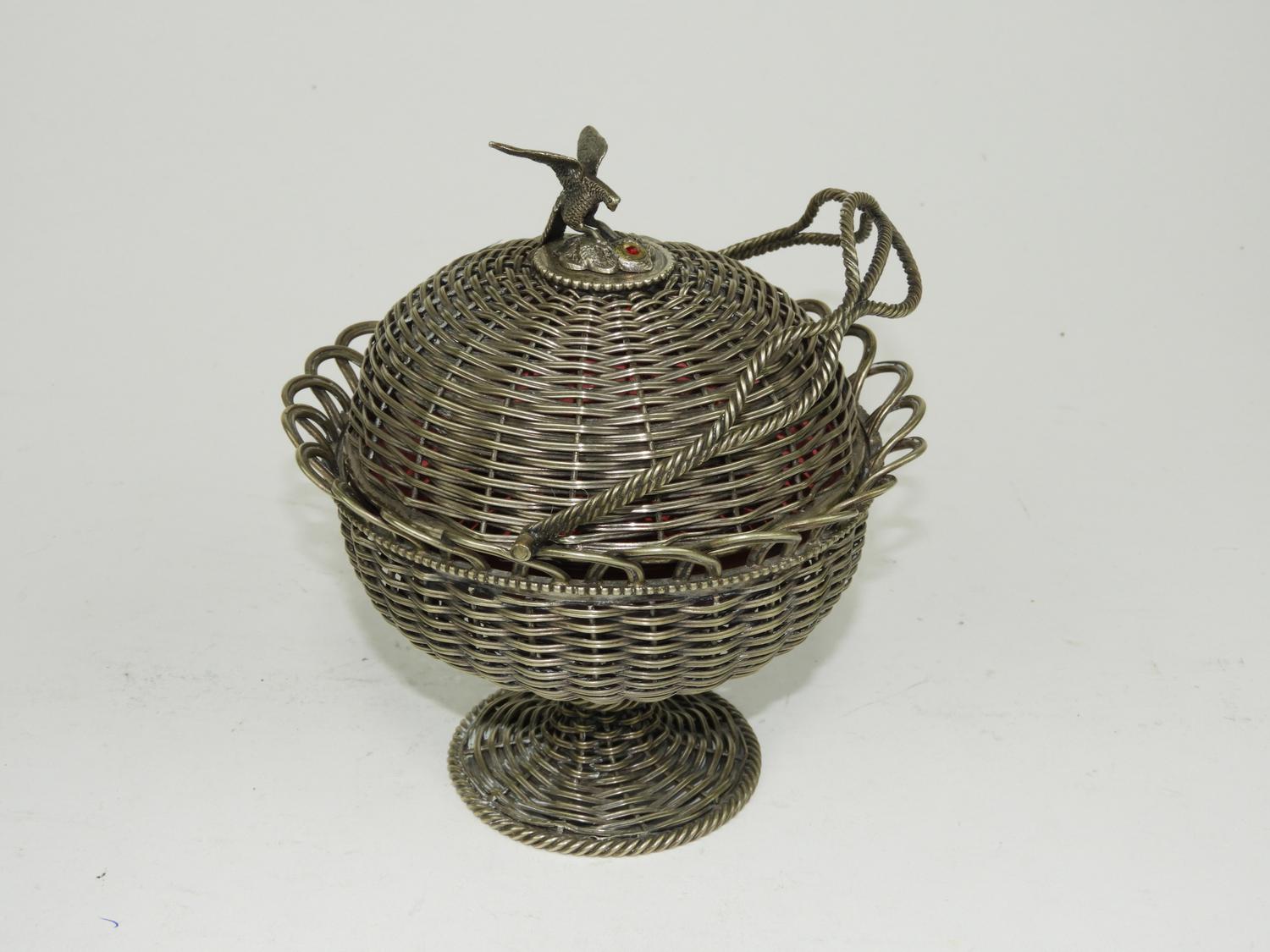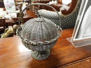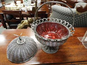 silver woven covered basket with cranberry glass liner, ht. 8"