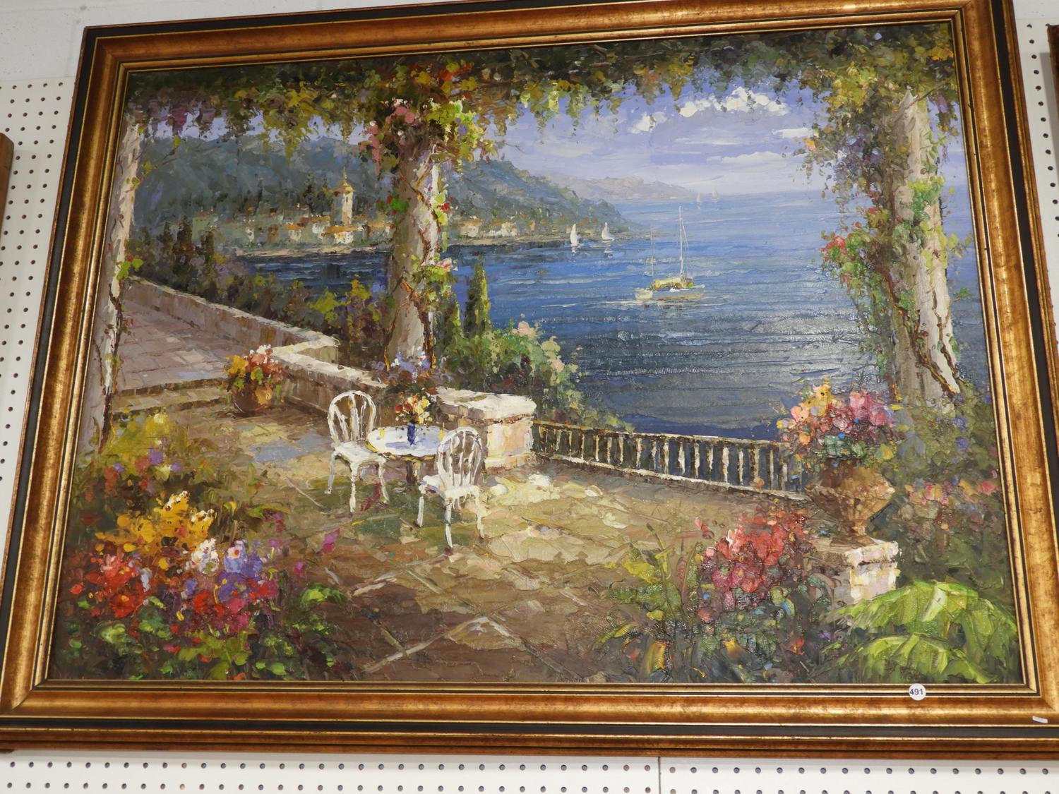 unsigned oil on canvas, 36" x 48", "mediterranean view".