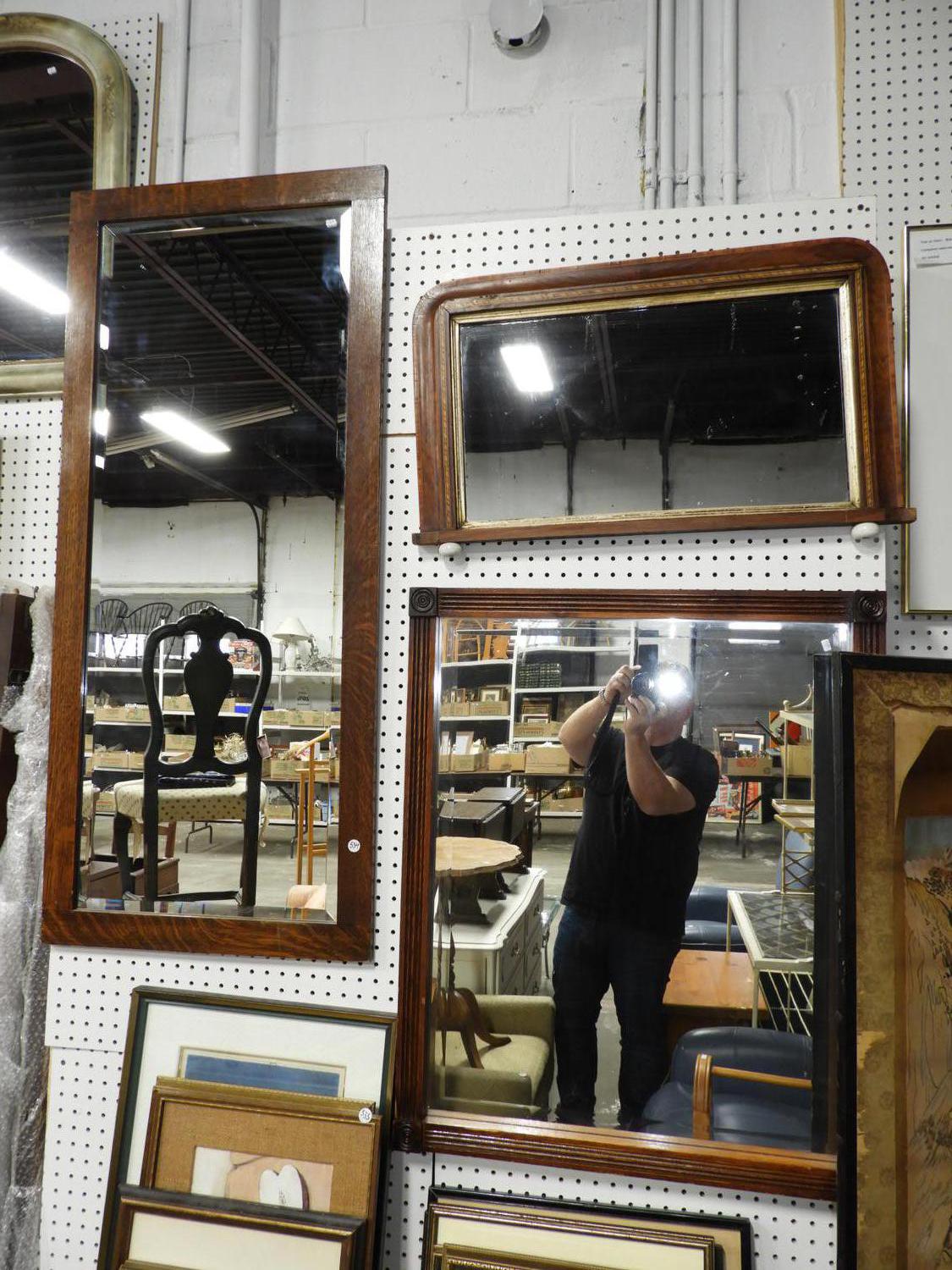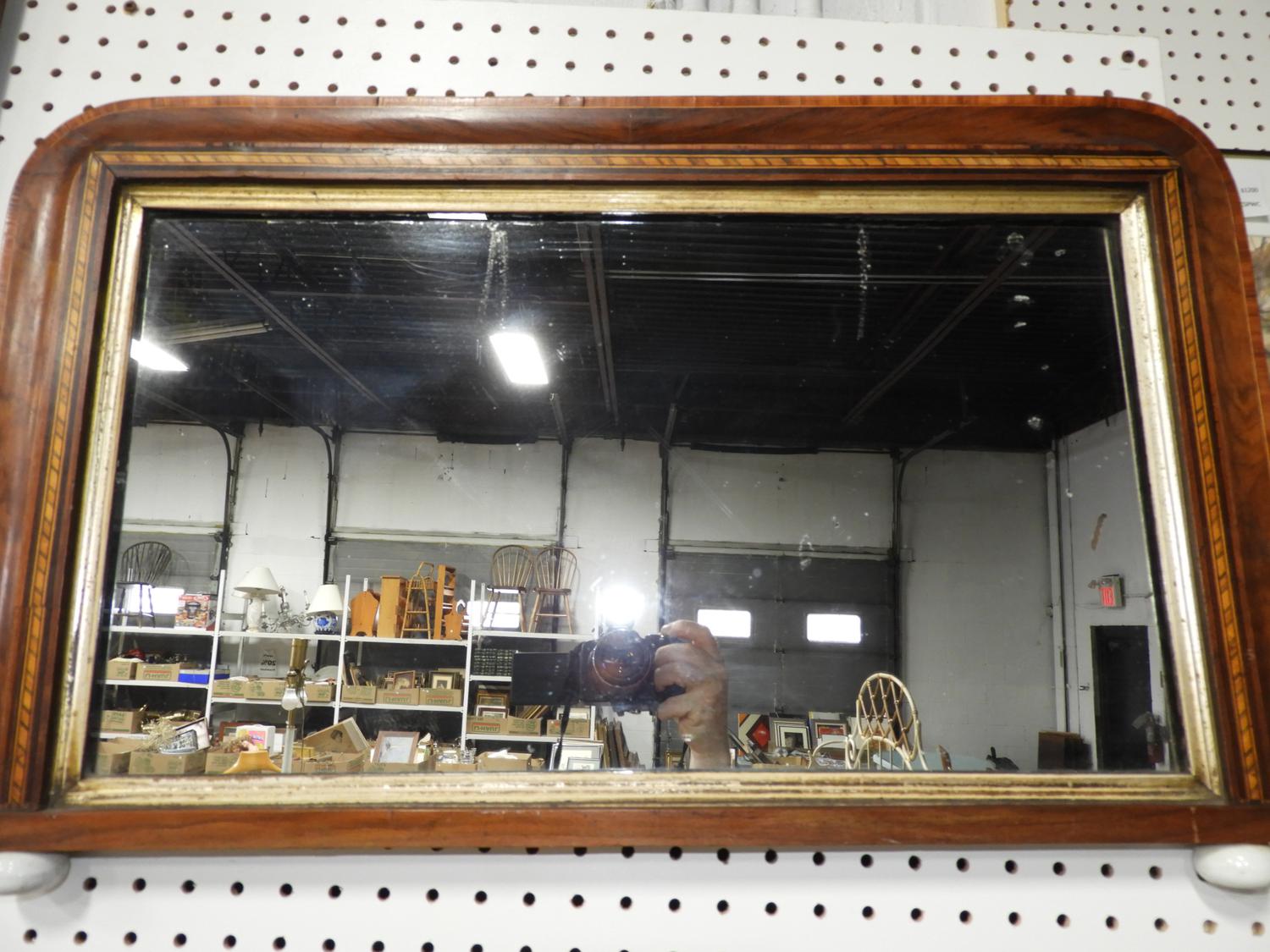 19th century inlaid walnut mirror and two oak framed mirrors.