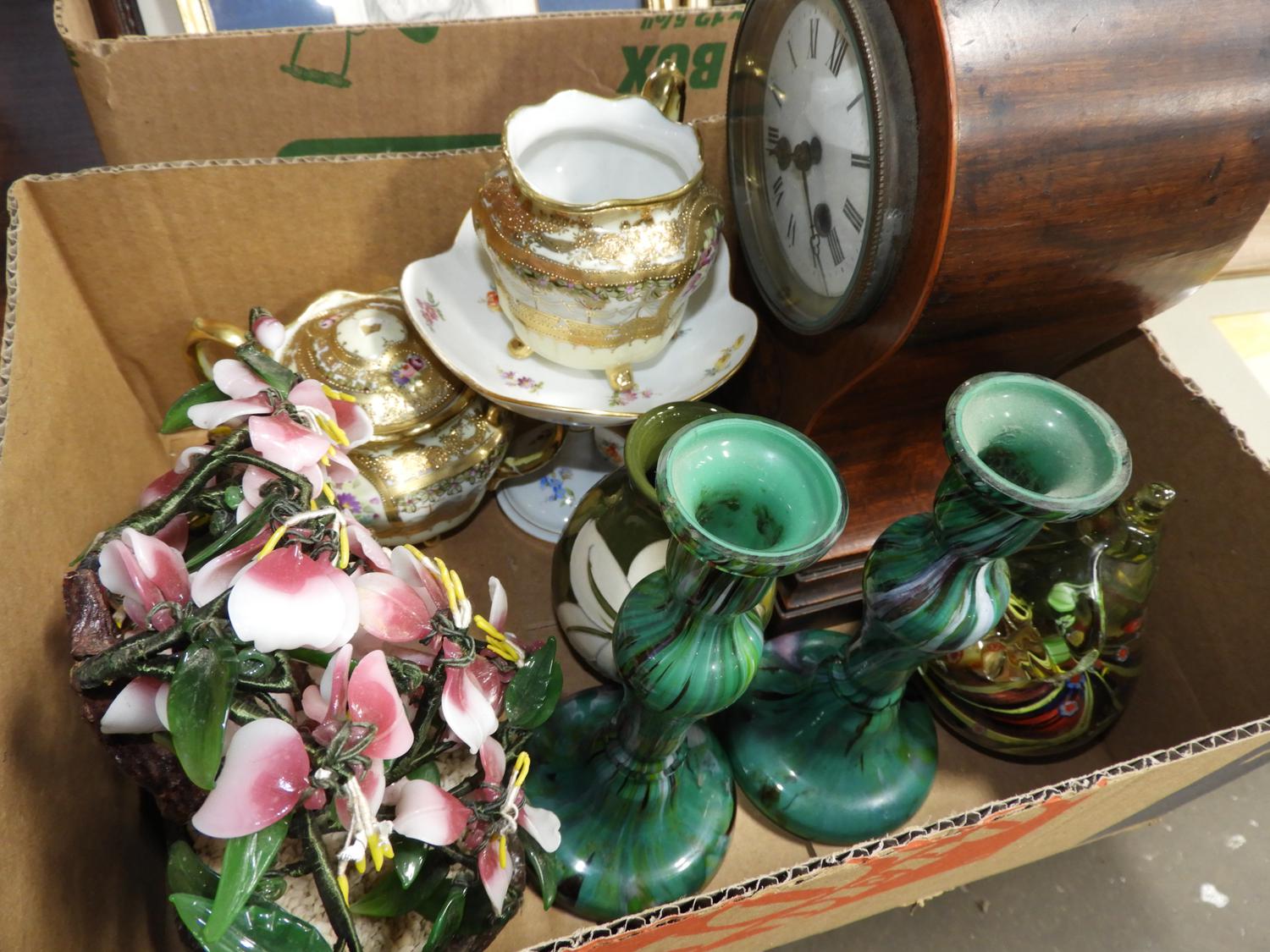 lot including clock, meissen comport, moorcroft vase, nippon cream and sugar, jade tree and three pieces of glass.