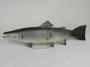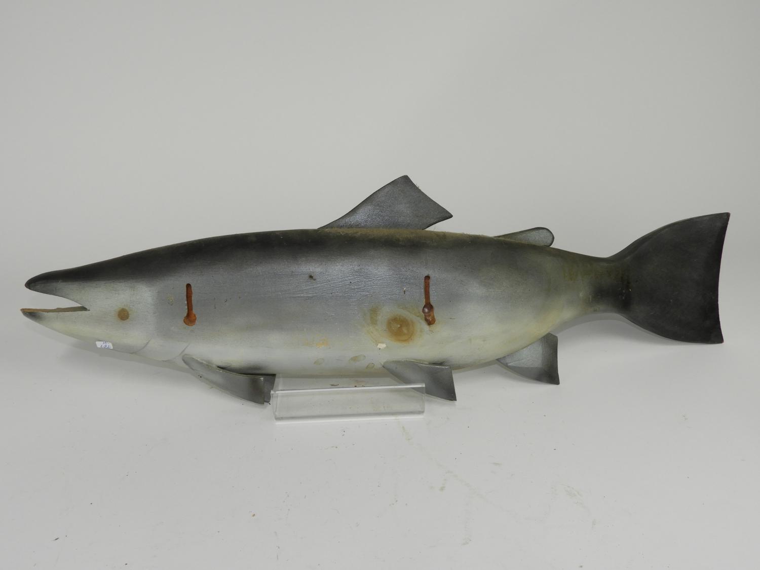 quebec folk art carved and painted salmon decoy, length 30".