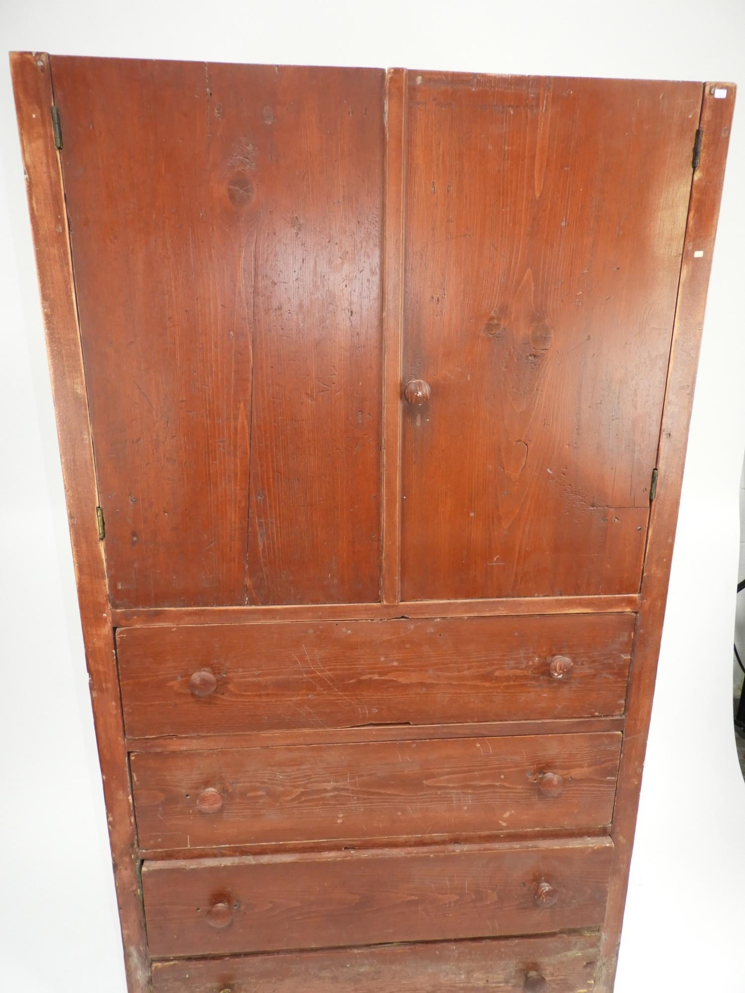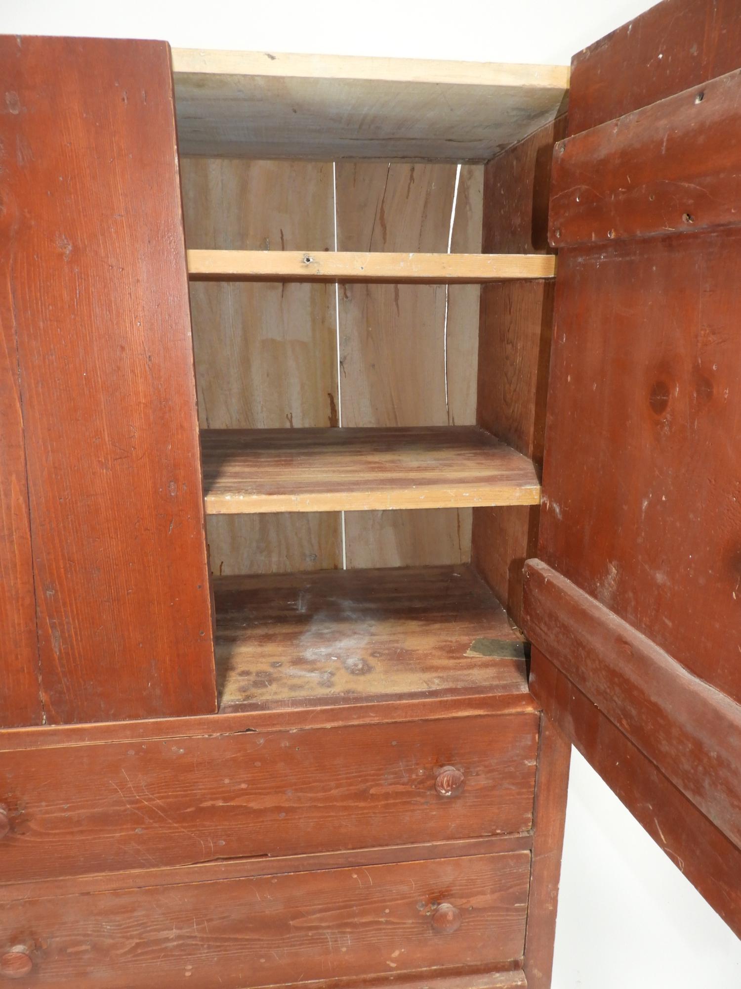 painted pine rustic cupboard with drawers, early 20th century, 68" x 37" x 19".