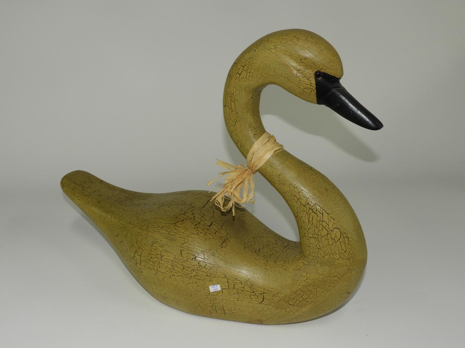 carved and crakle painted swan decoy signed natalie rancourt.
