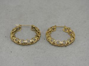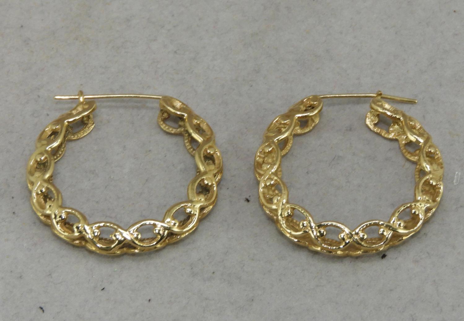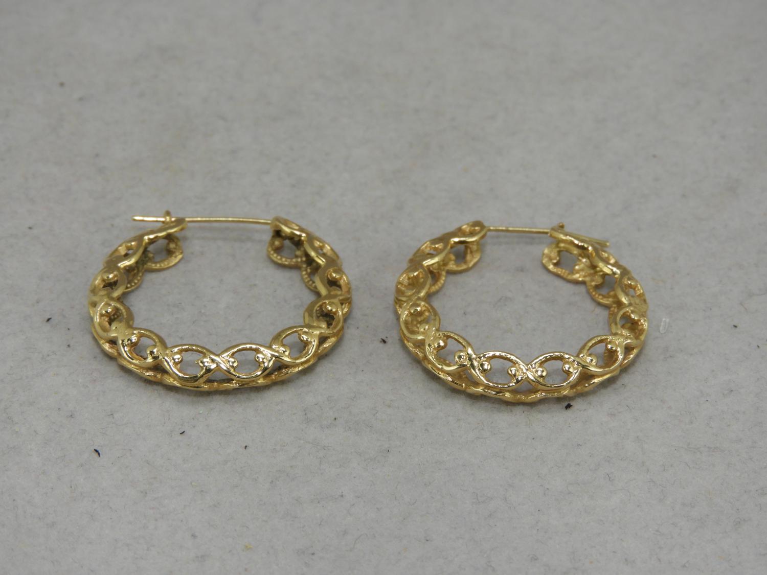 14k yellow gold openwork hoop earrings, 9.4grams, diameter 1 1/4"