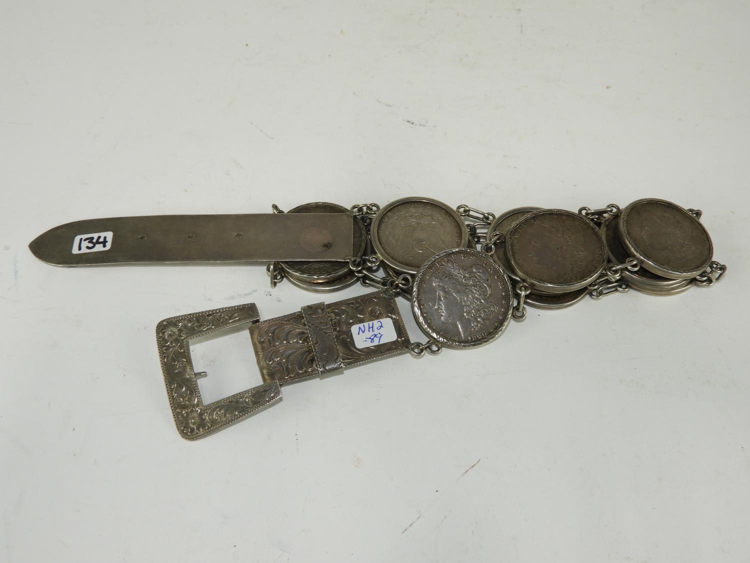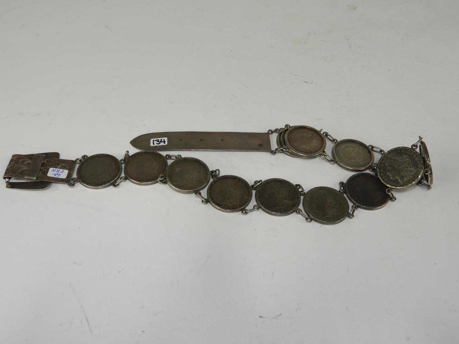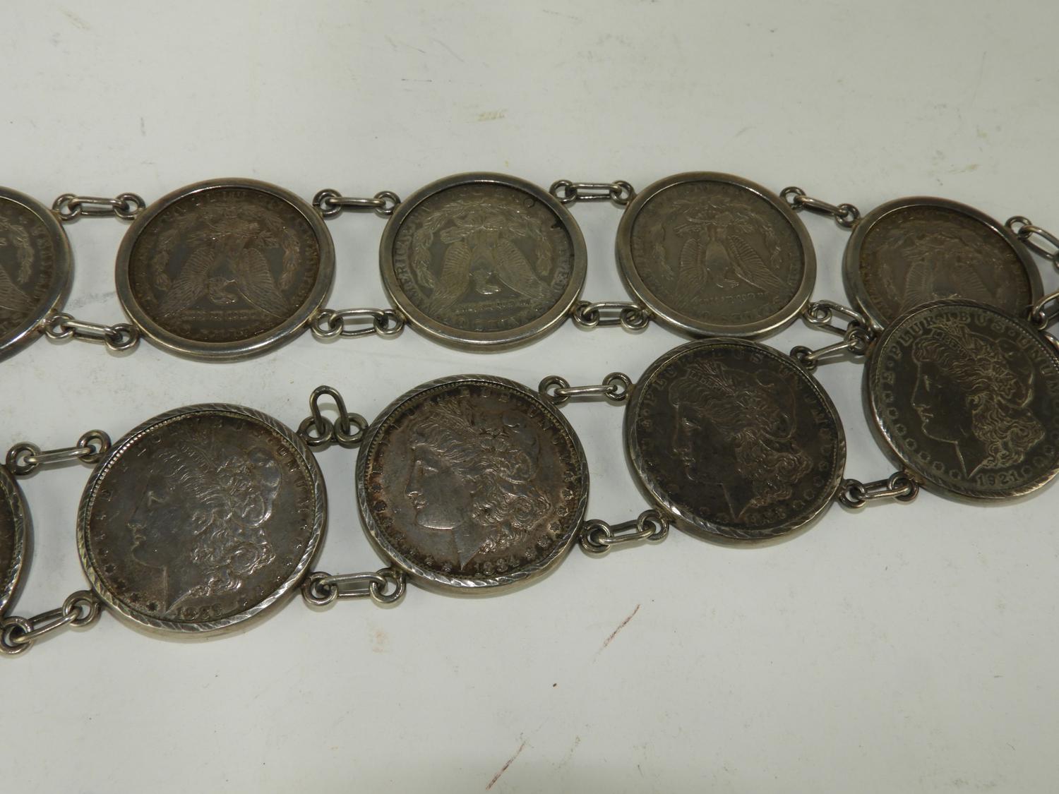 vintage coin belt constructed with 14 american morgan silver dollars 1880-1921.