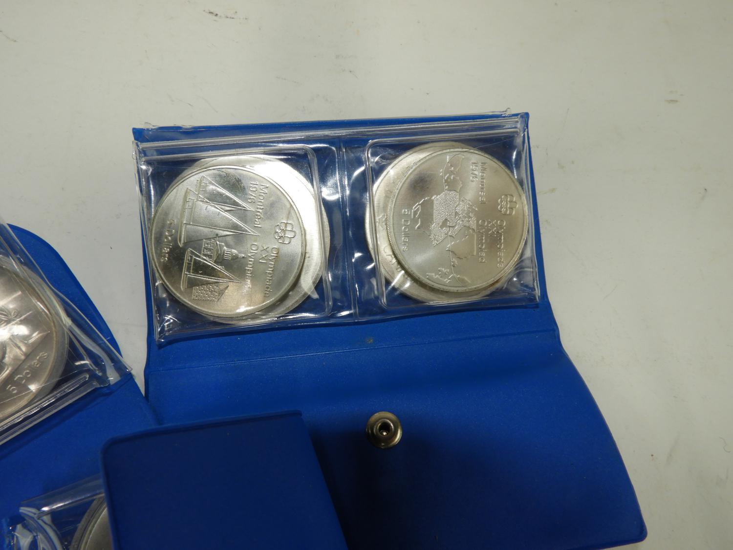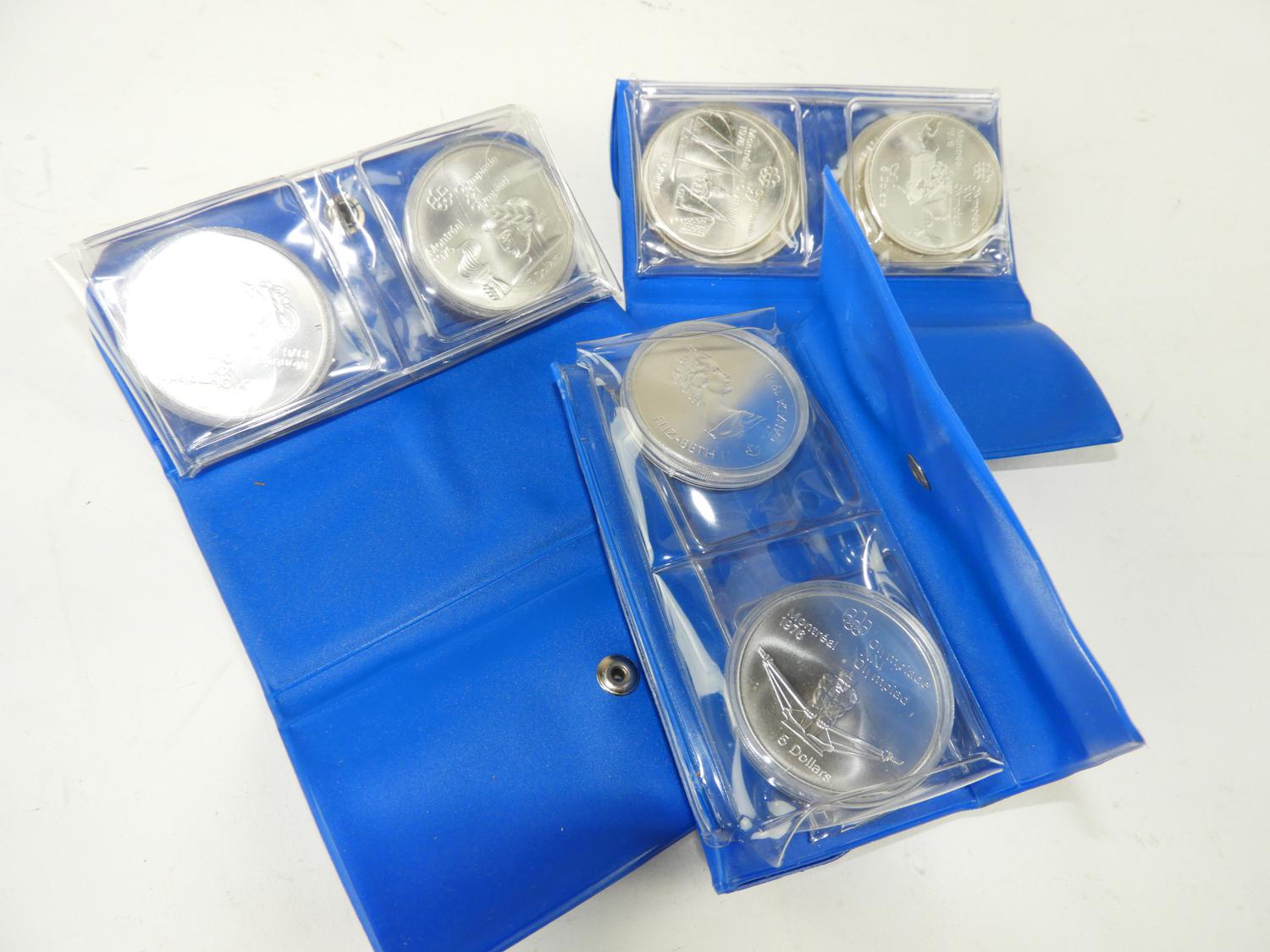 6 montreal olympic $5 silver coins with 2 montreal olympic $10 silver coins.