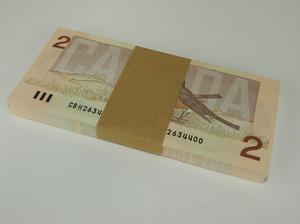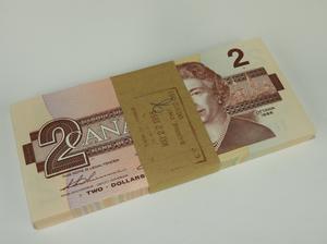 100 1986 canadian $2 notes uncirculated sequential with origianl bank of canada binding.