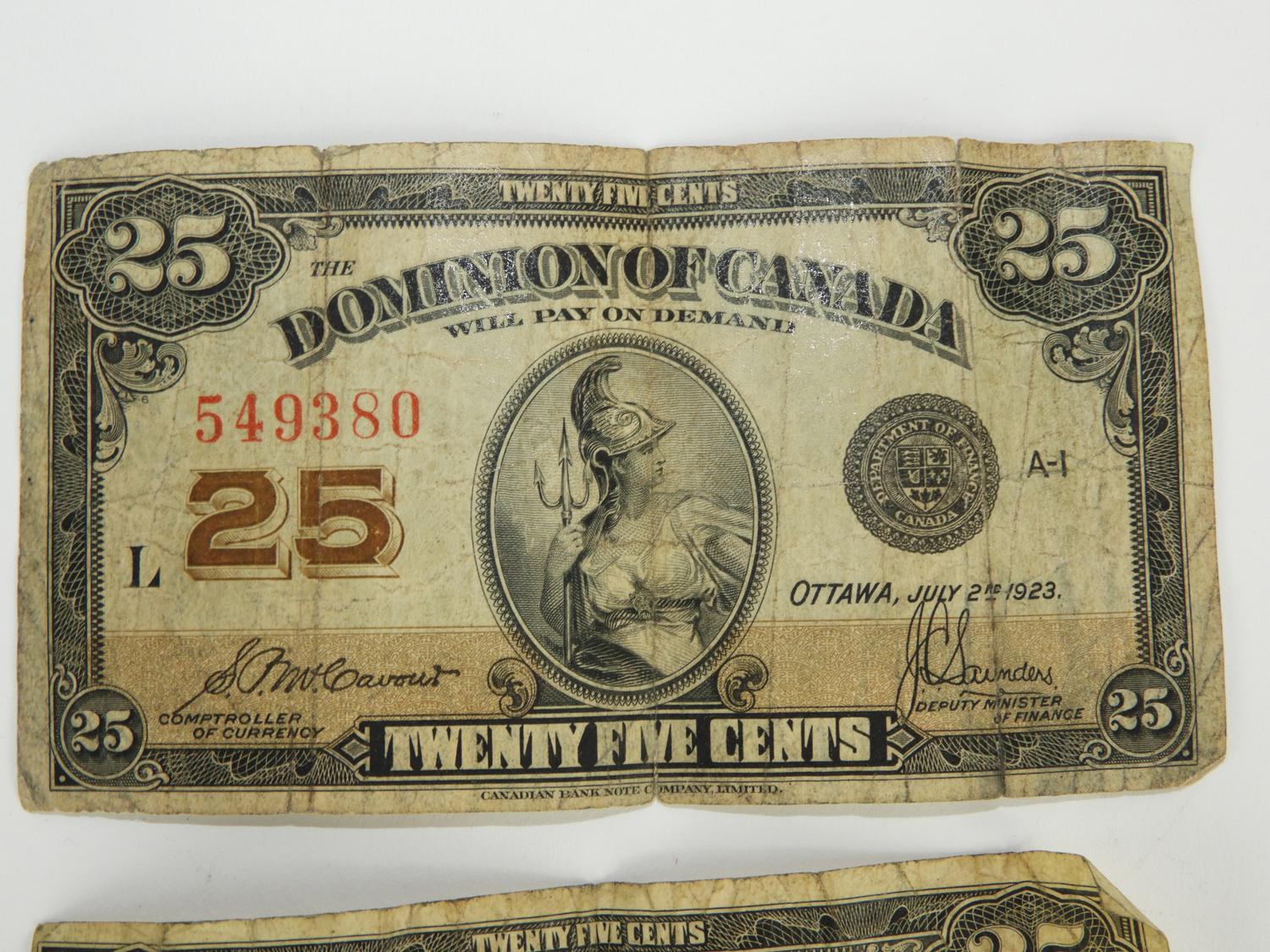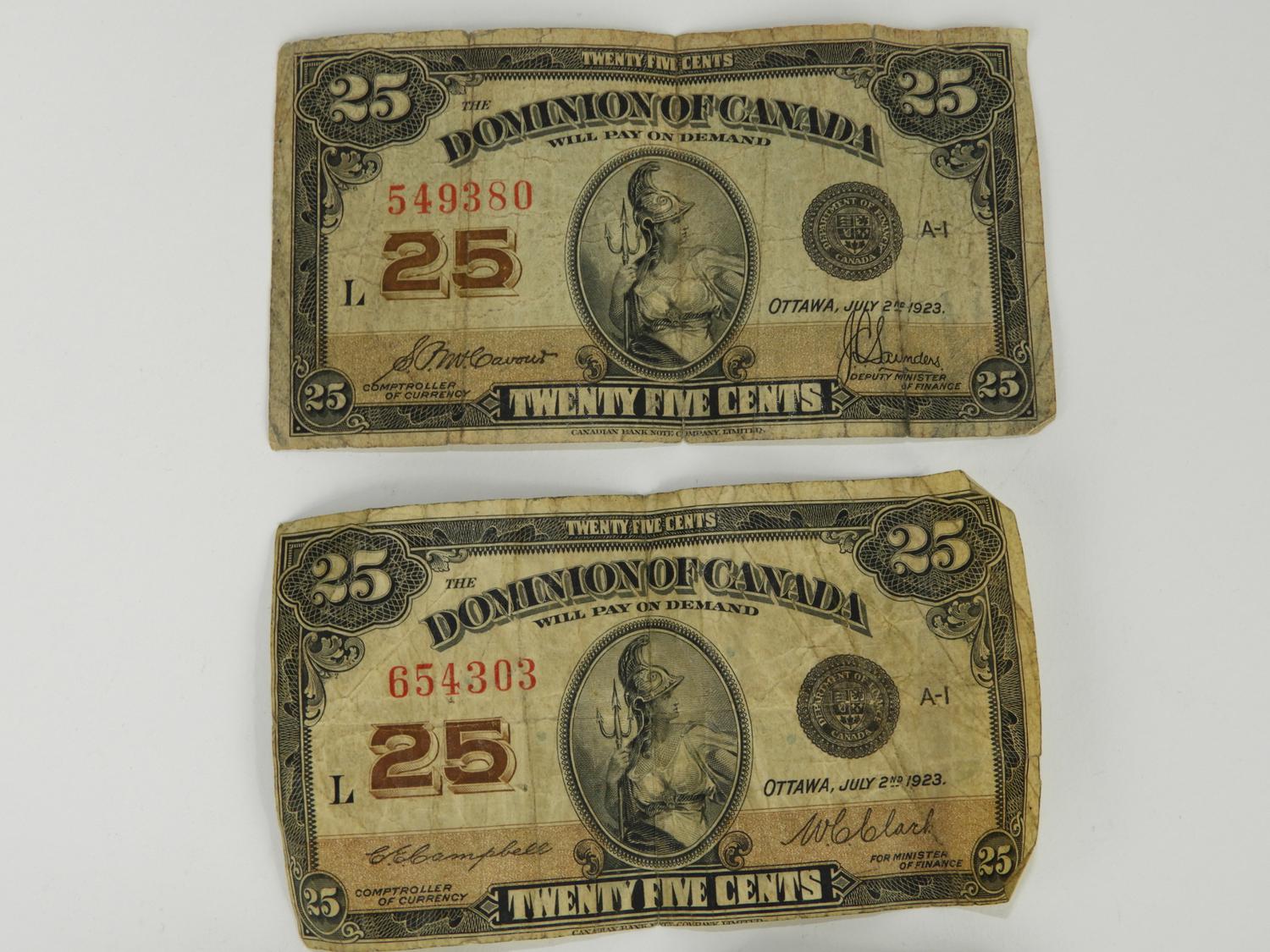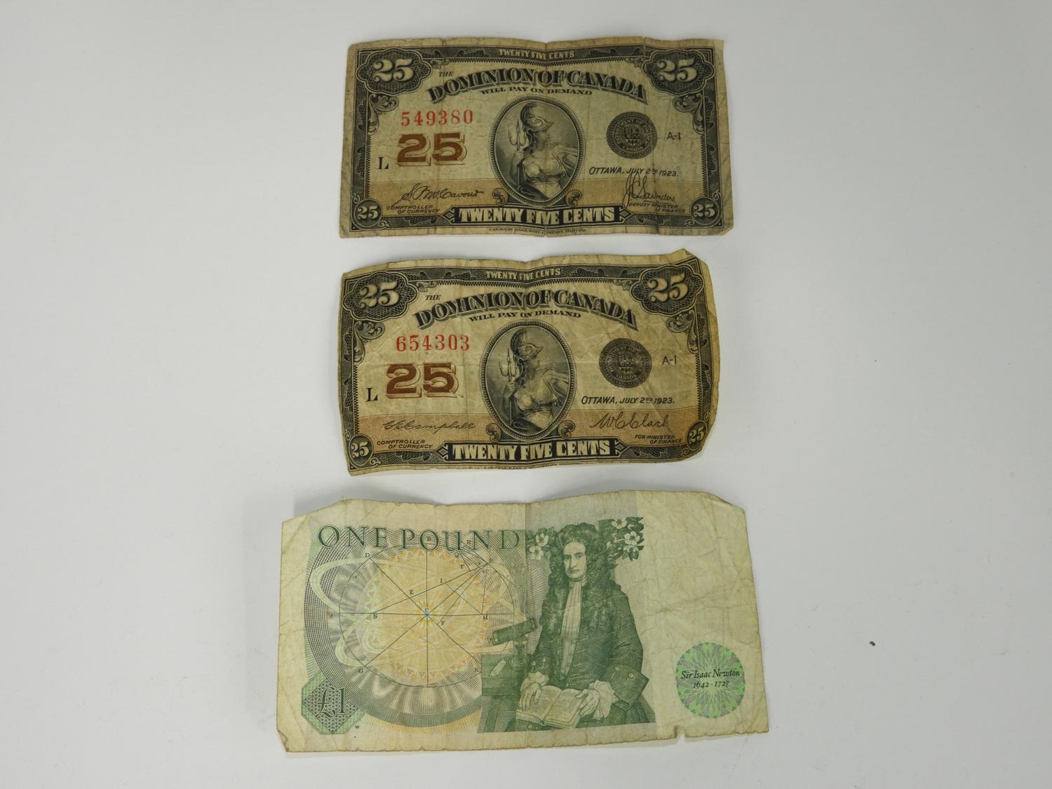 2 dominion of canada 25 cent notes with a bank of england one pound note.