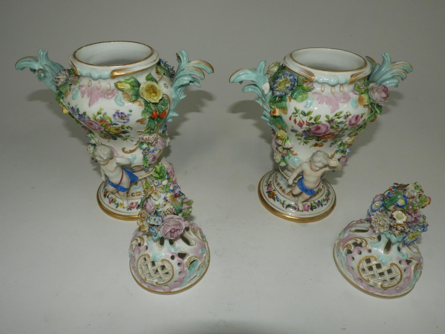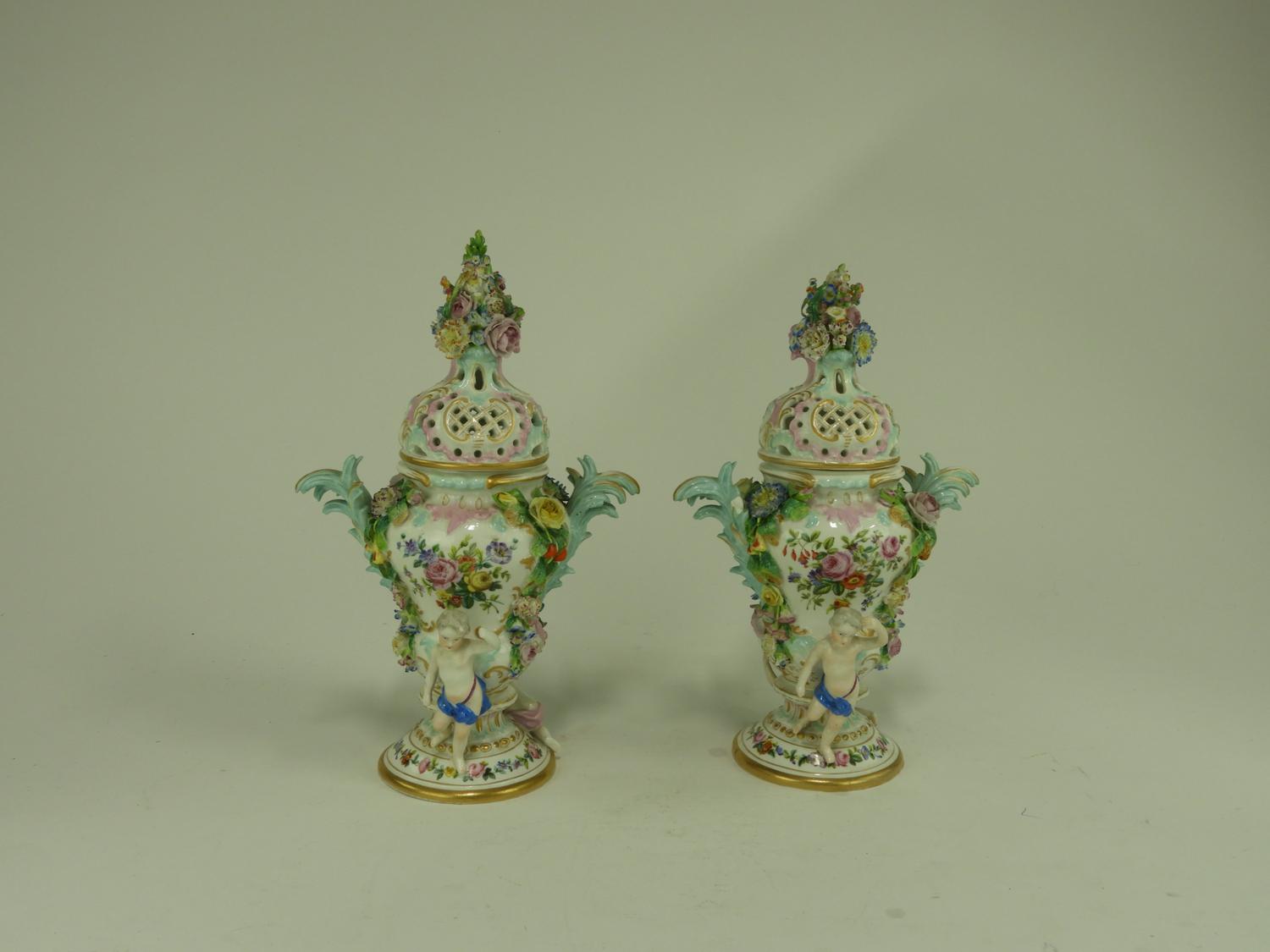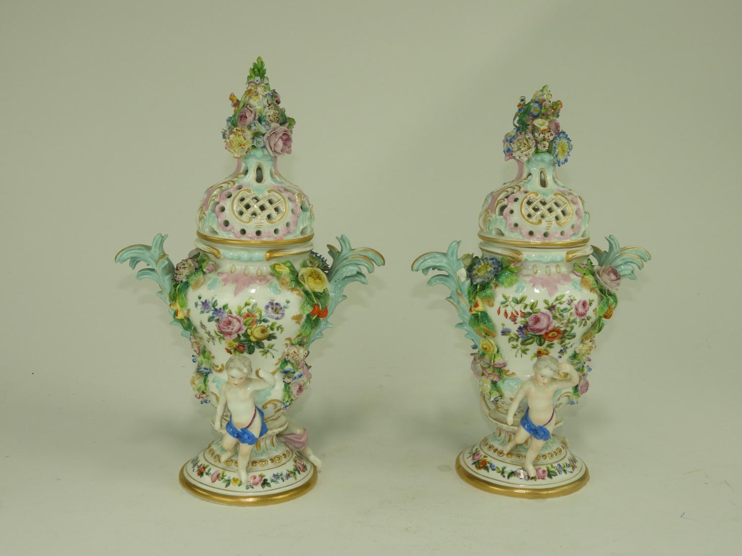 pair of meissen hand painted porcelain covered vases, losses, ht. 13 1/2"