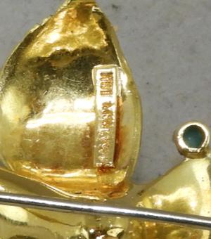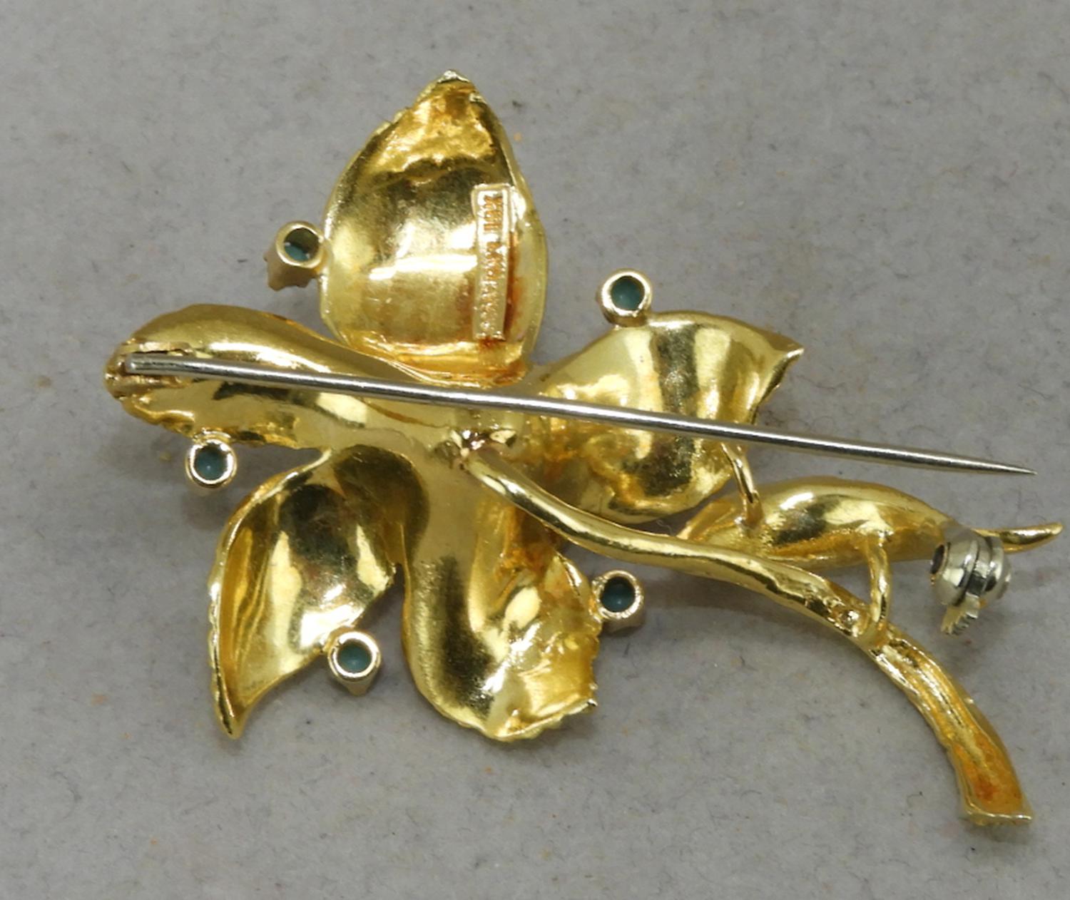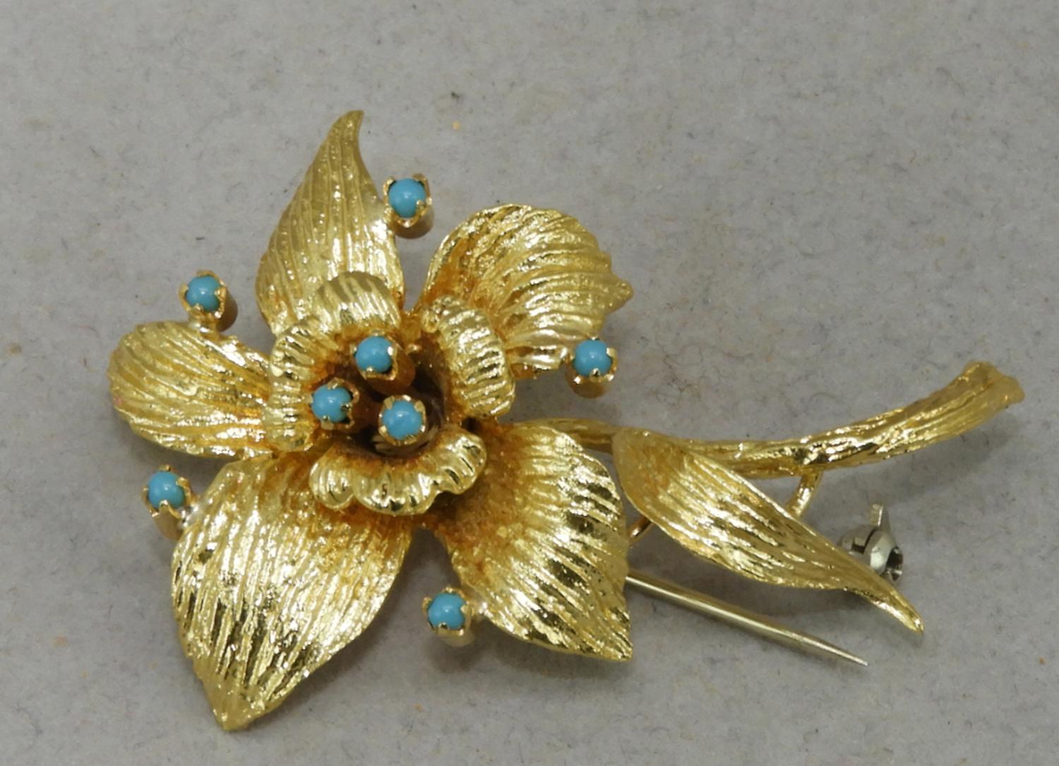 18k gold turquoise flower brooch, 14.1grams, 2" in height