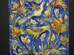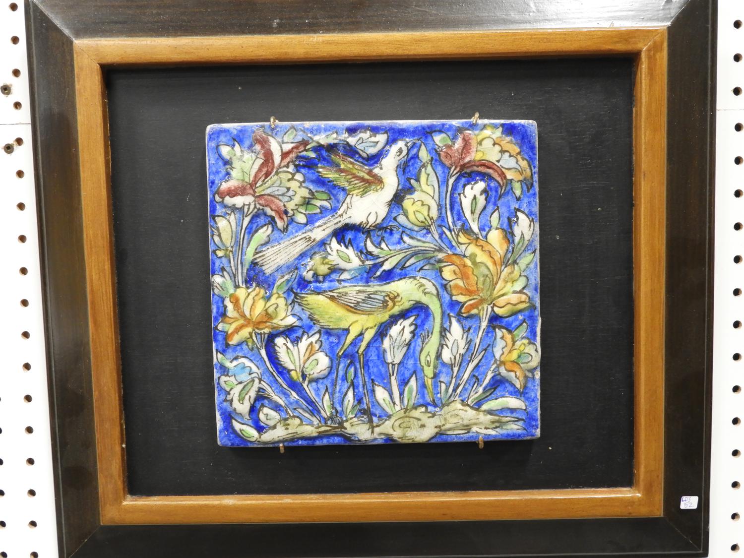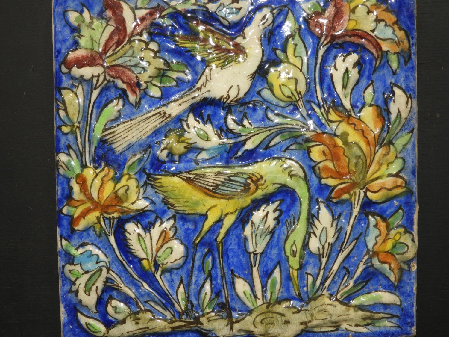 framed persian tile, 9" x 9", "birds and flowers".