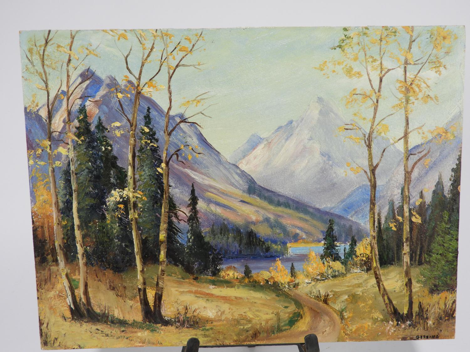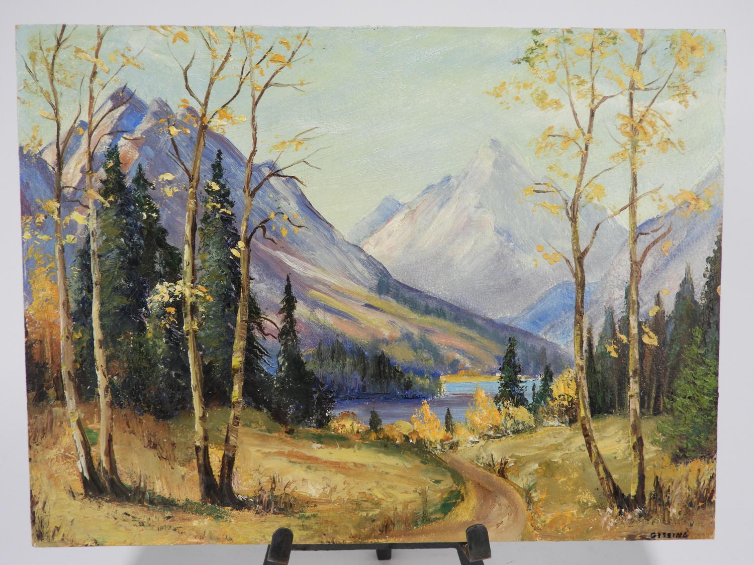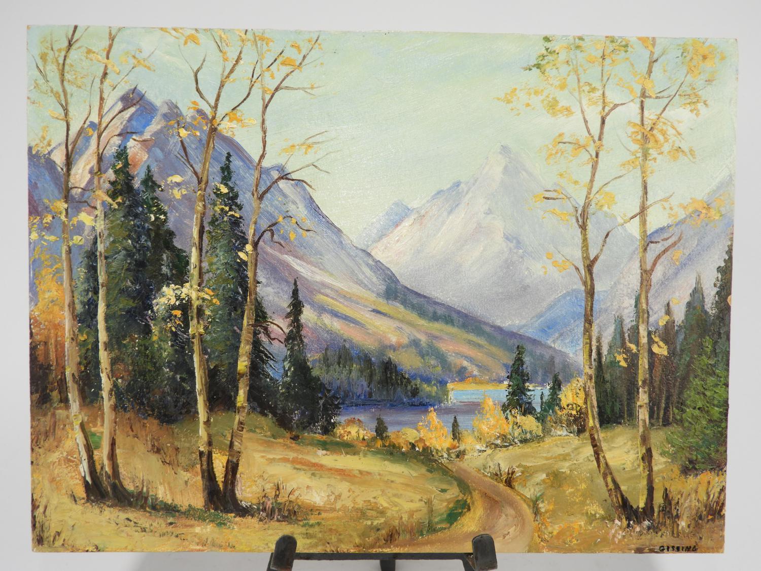 attributed to gissing, oil on board, 12" x 16", "mountain landscape".