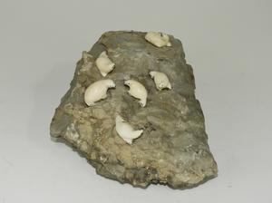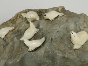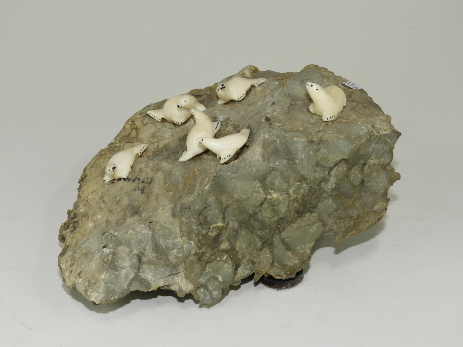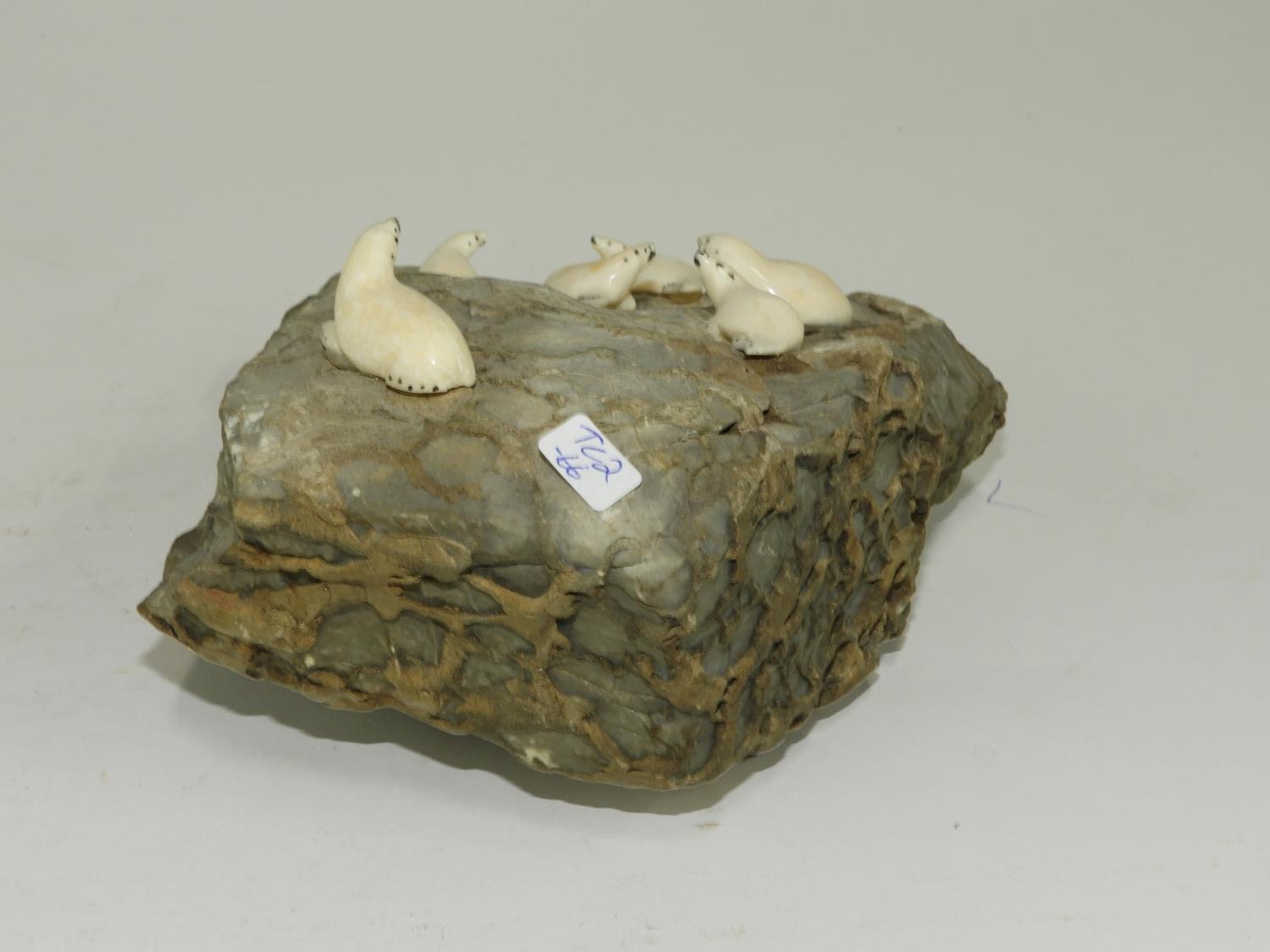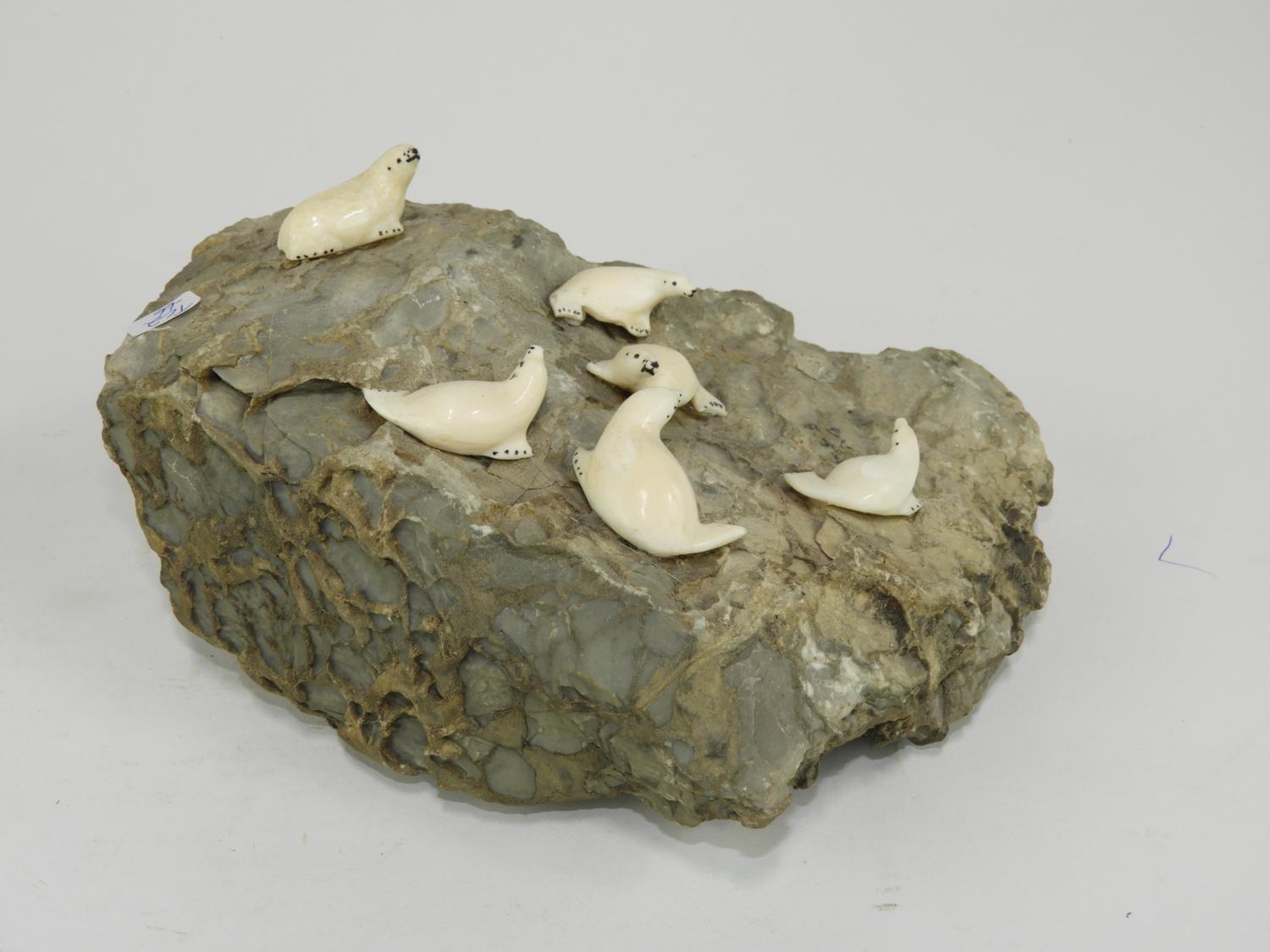 group of carved ivory seals on basking rock, 4" x 8"