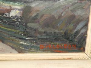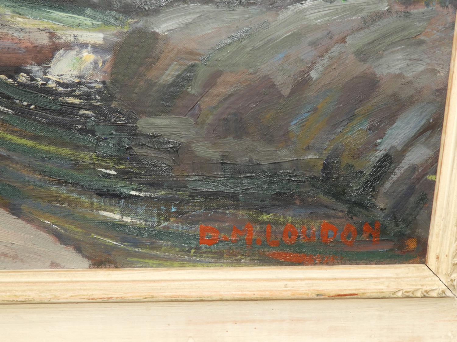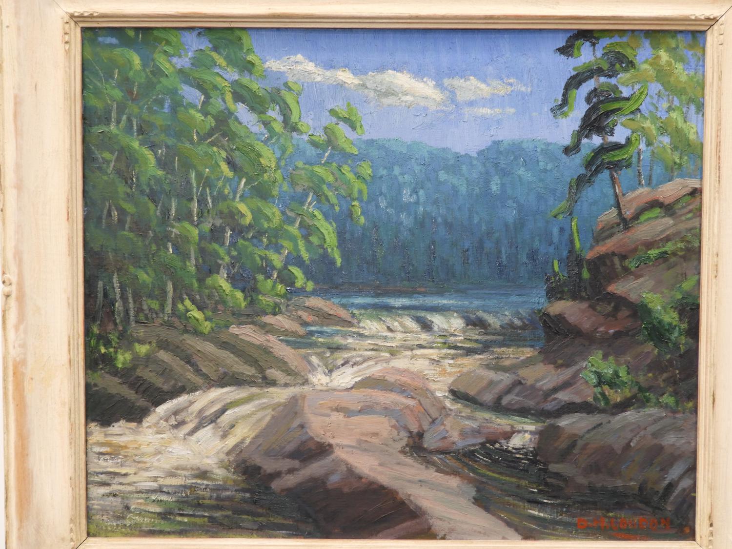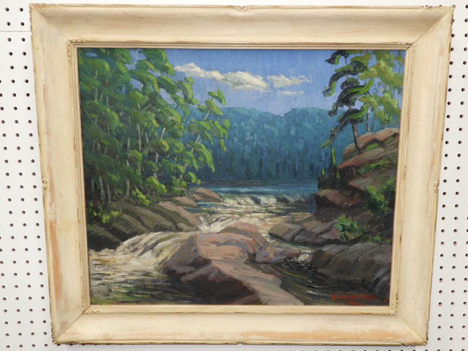 d. m. loudon, oil on board, 20" x 24", "lake scene with falls"