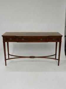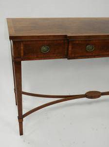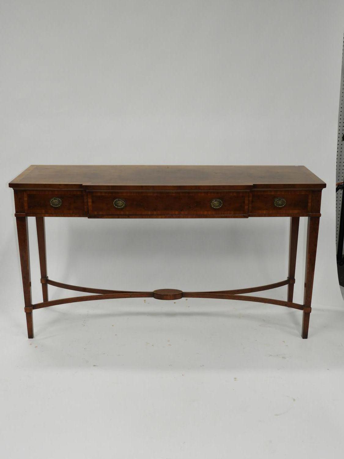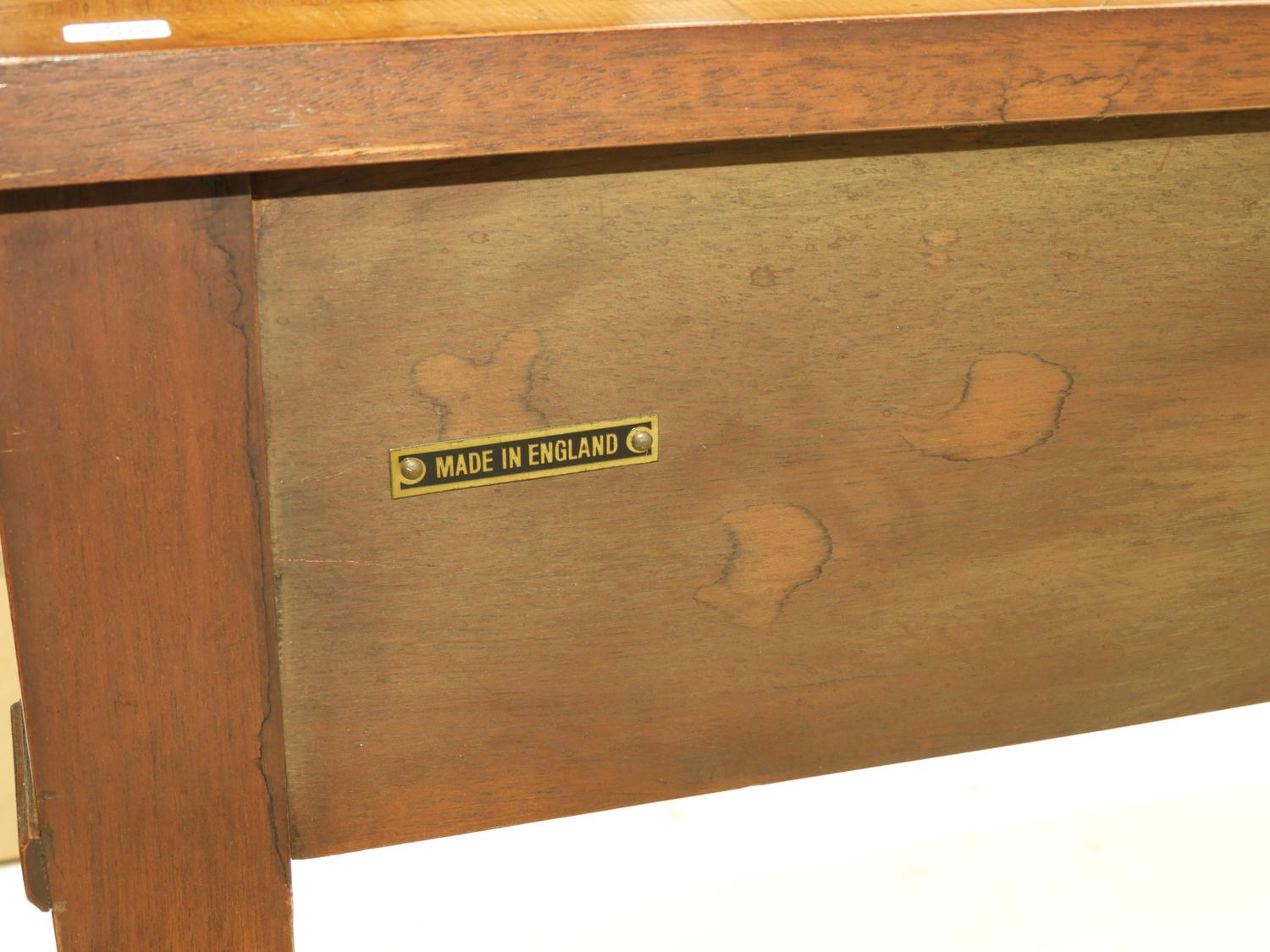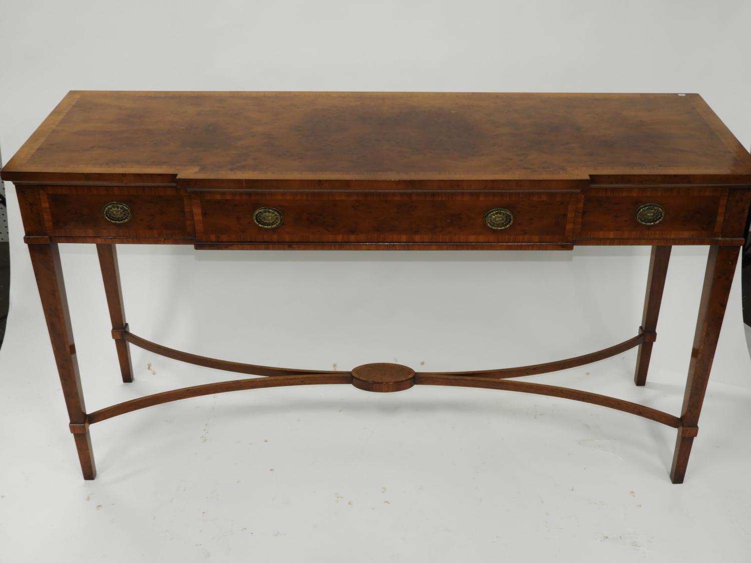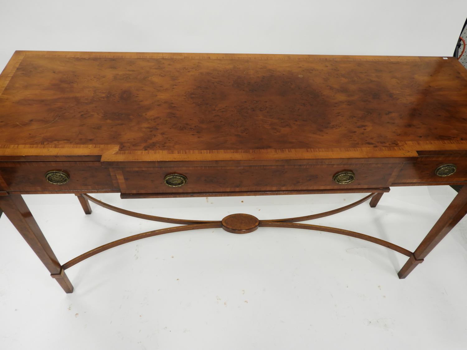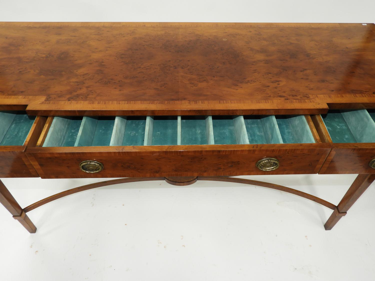 cross banded inlaid yew and mahogany console table with fitted drawers, label made in england,
