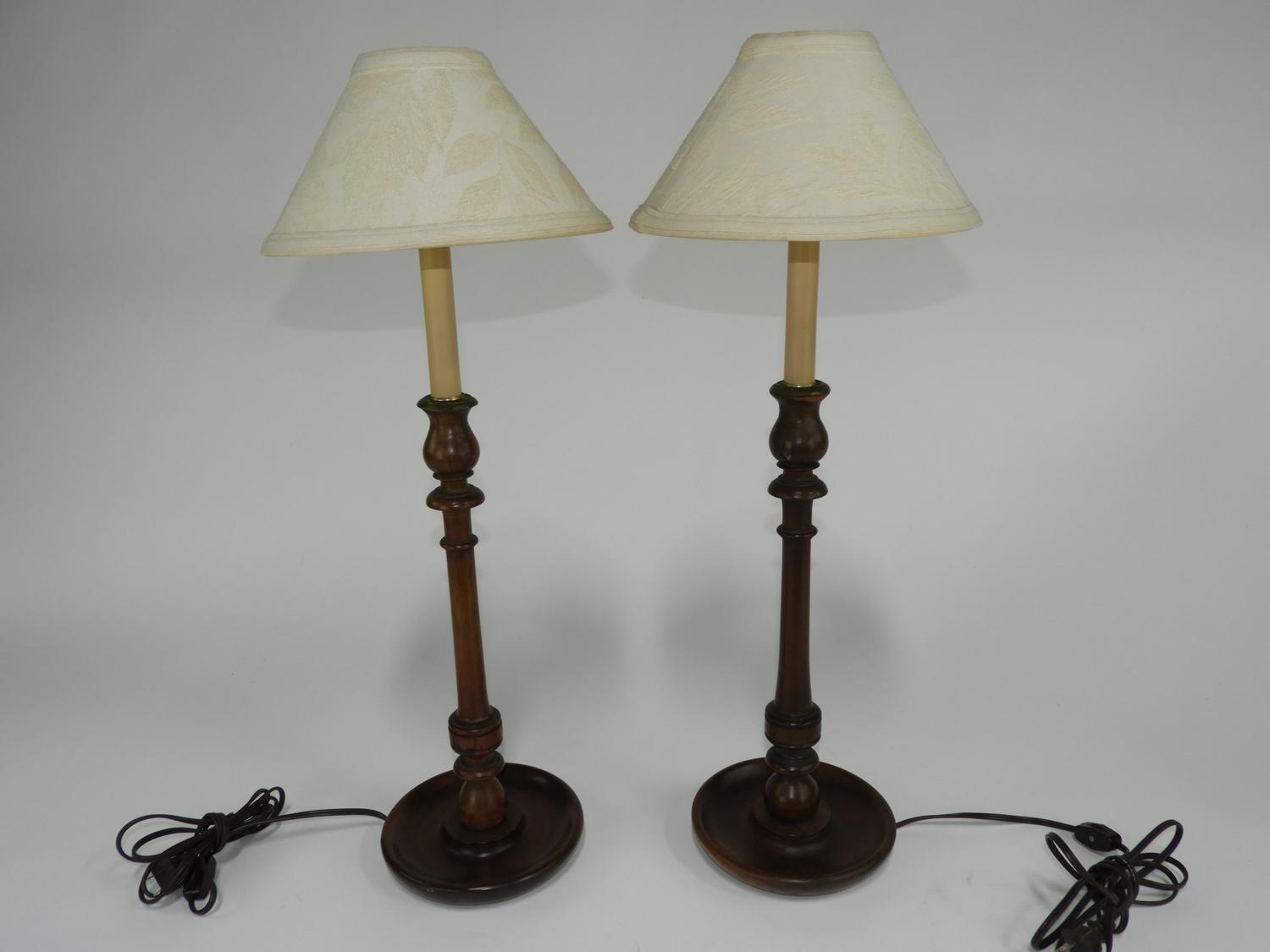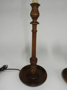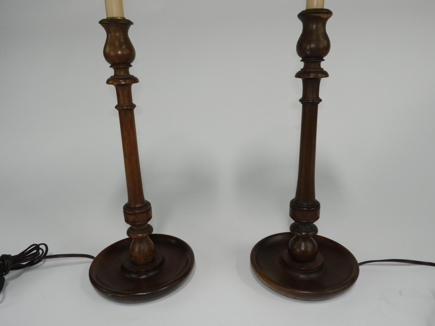 pair of turned walnut electrified candle sticks with shades, ht. 24".