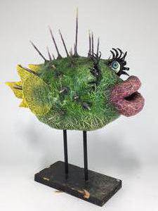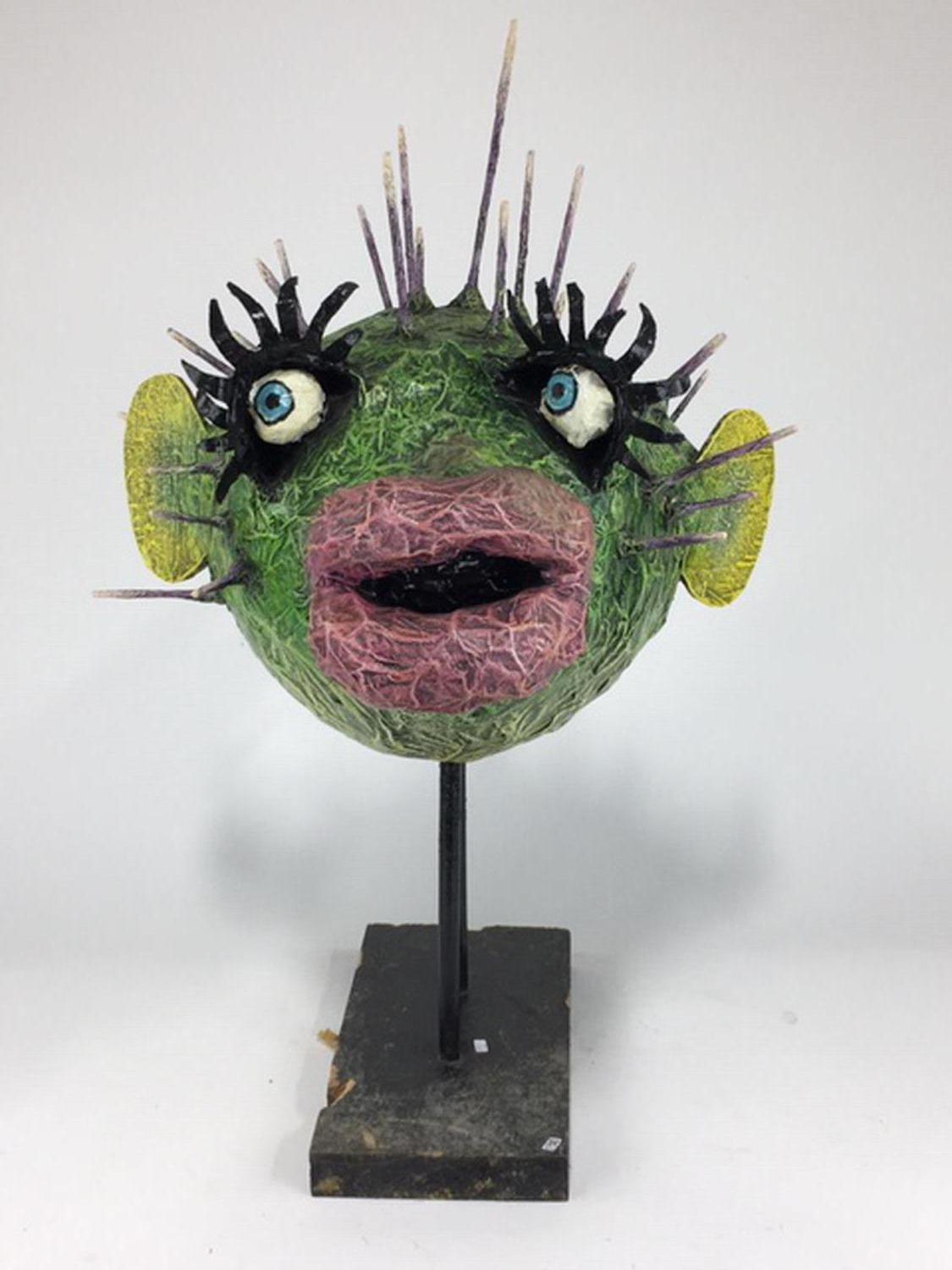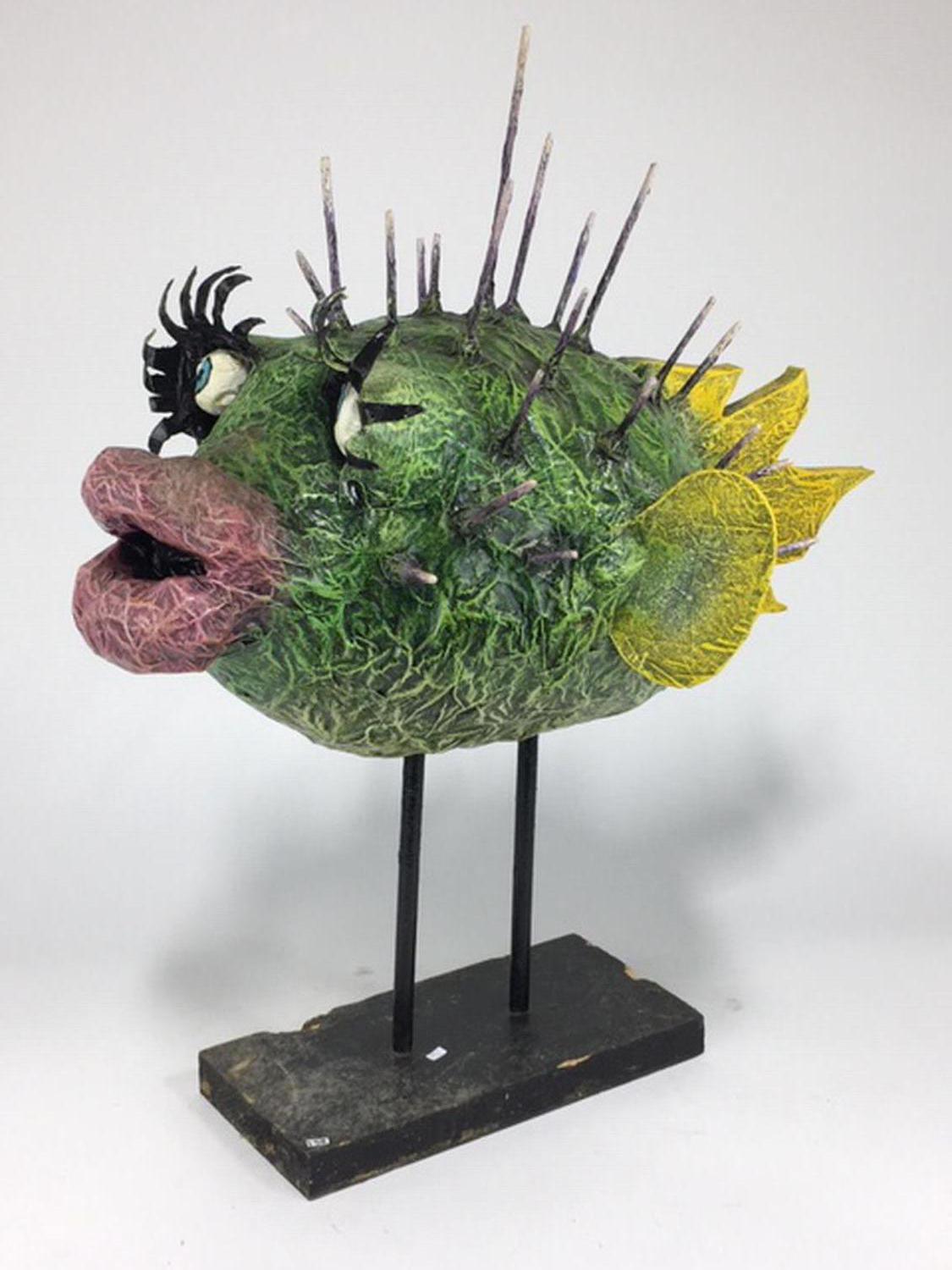 modern painted mixed media sculpture of a fish, 33" x 30".