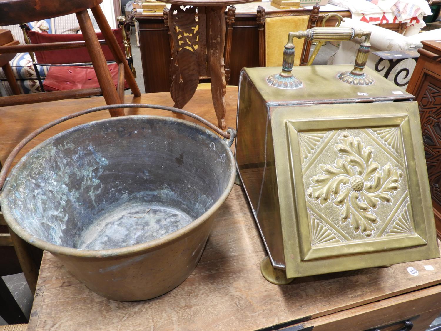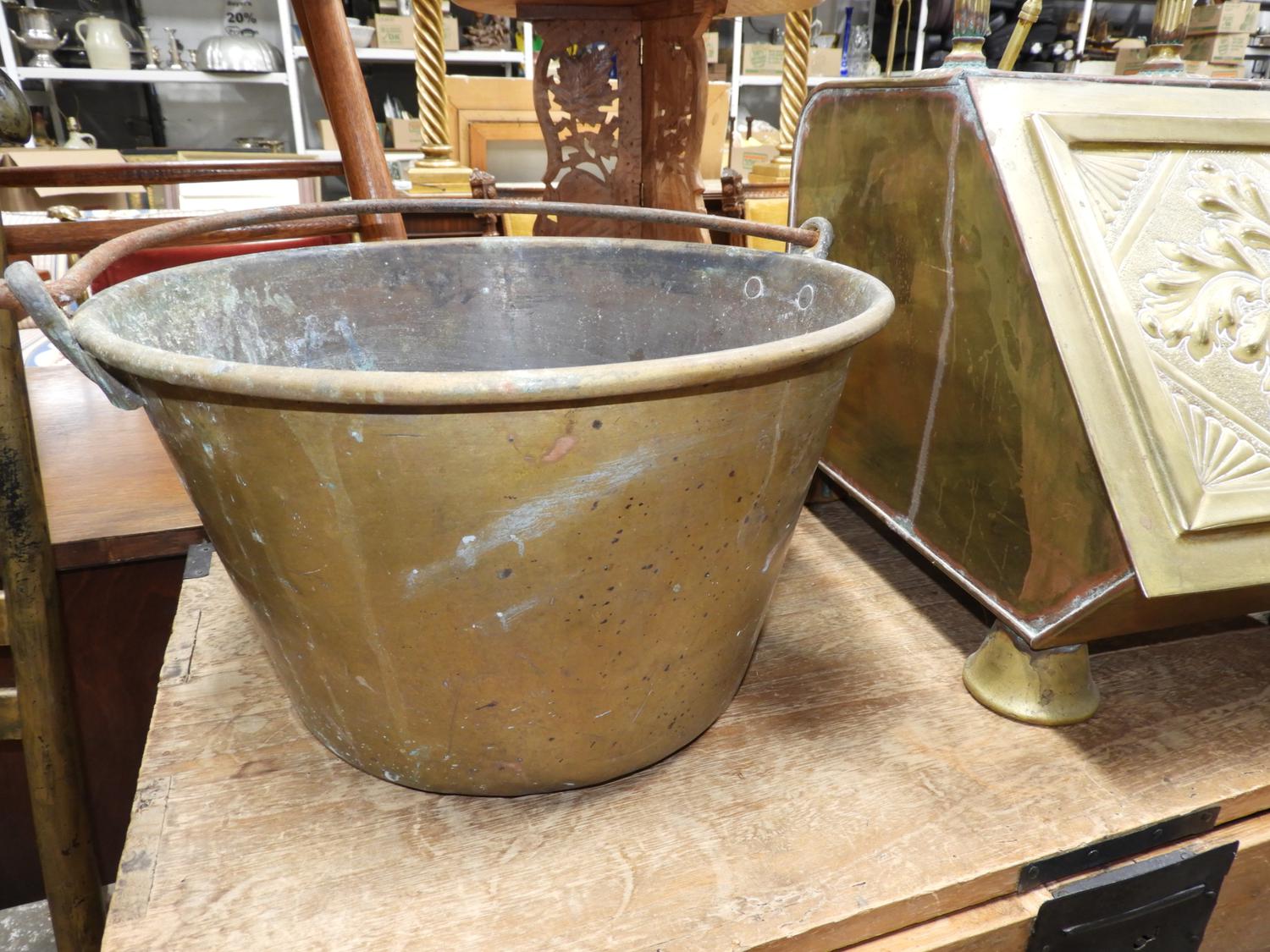 brass coal scuttle with a copper jelly pan with bail handle.