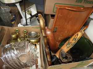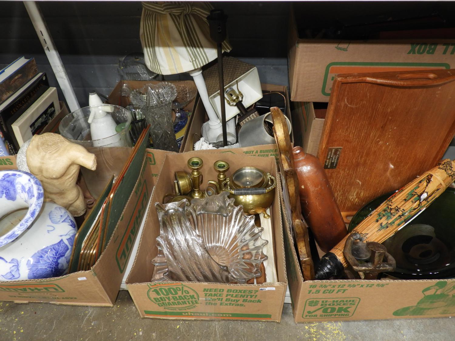 7 boxes of misc. decorative items, lighting, glass, brass, etc.