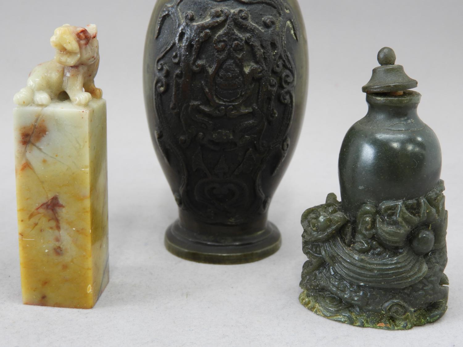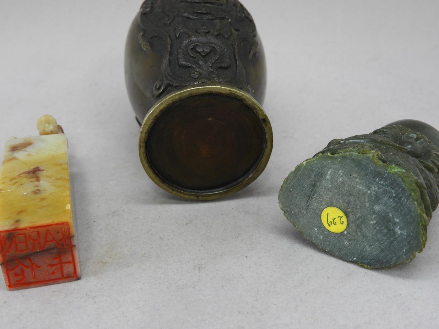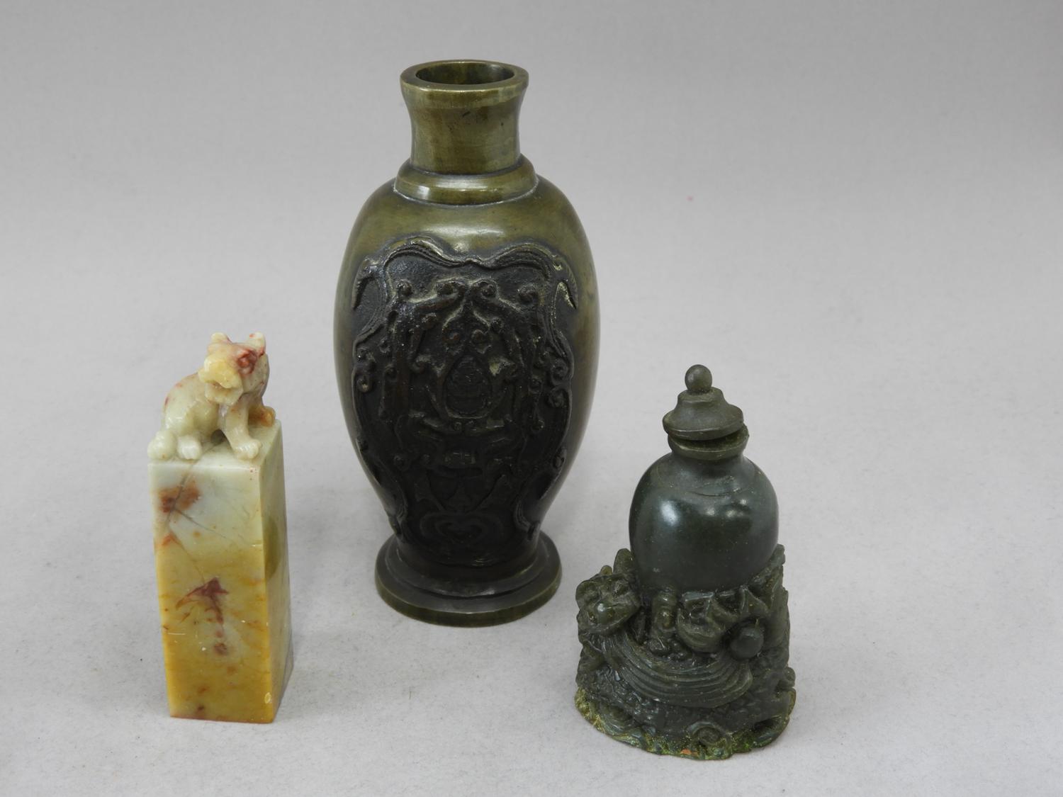 asian bronze vase, carved snuff bottle and seal