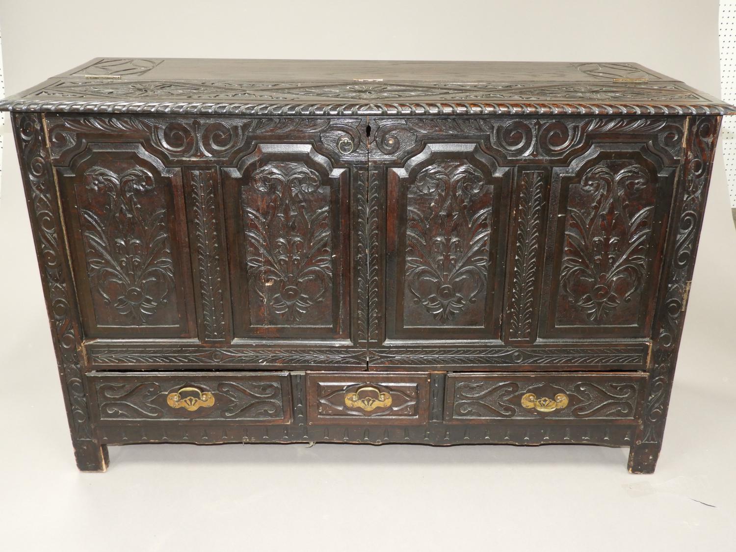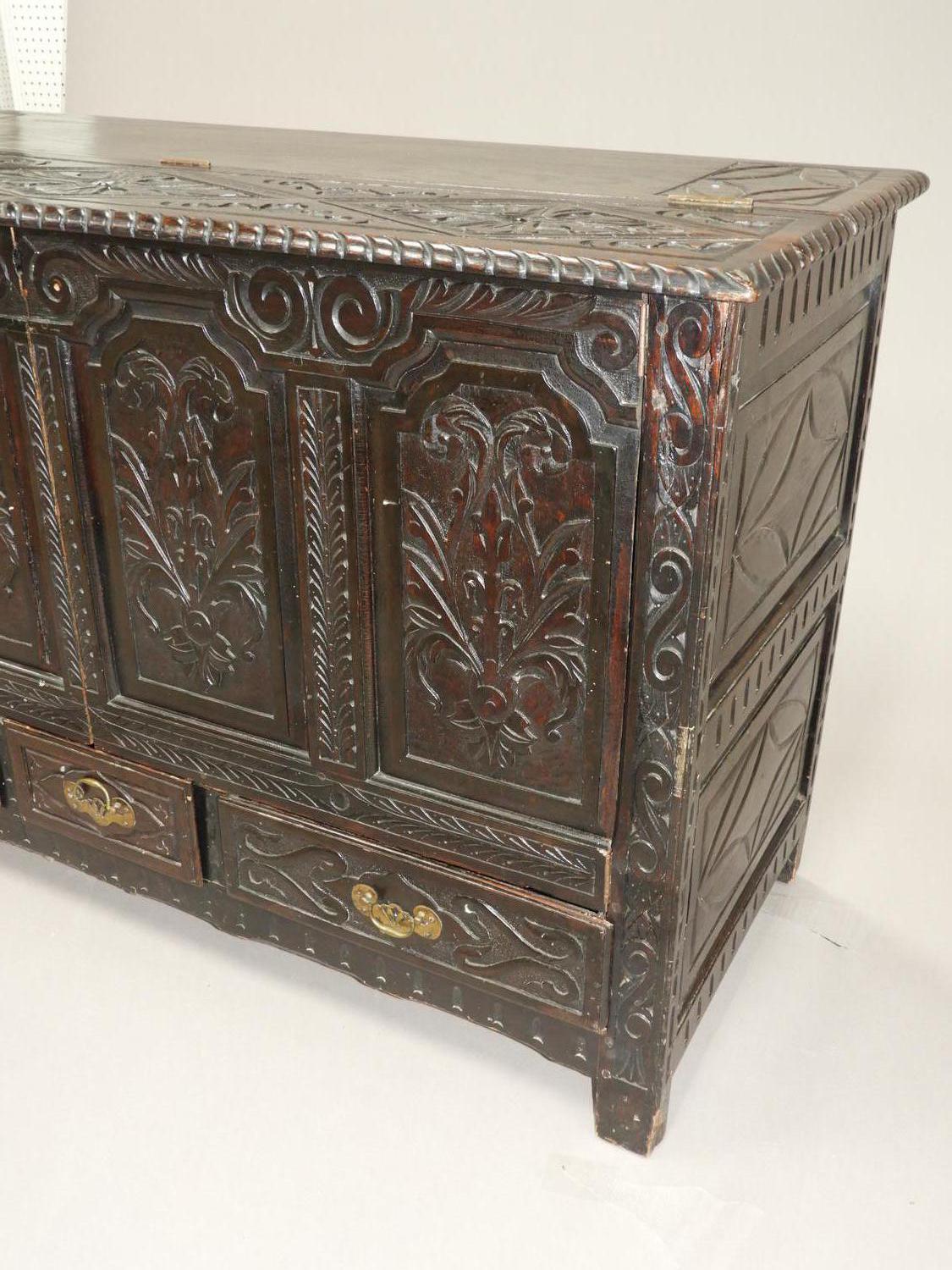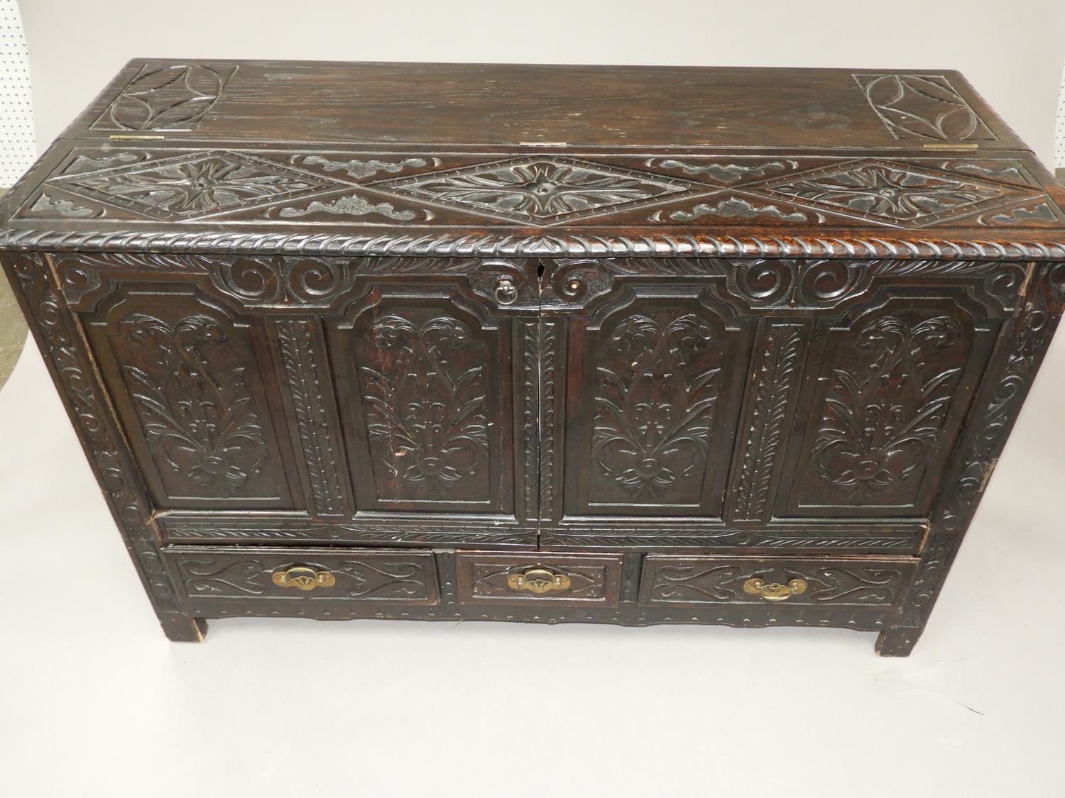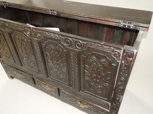 carved oak coffer in the 17th century english manner, 35" x 56" x 23"