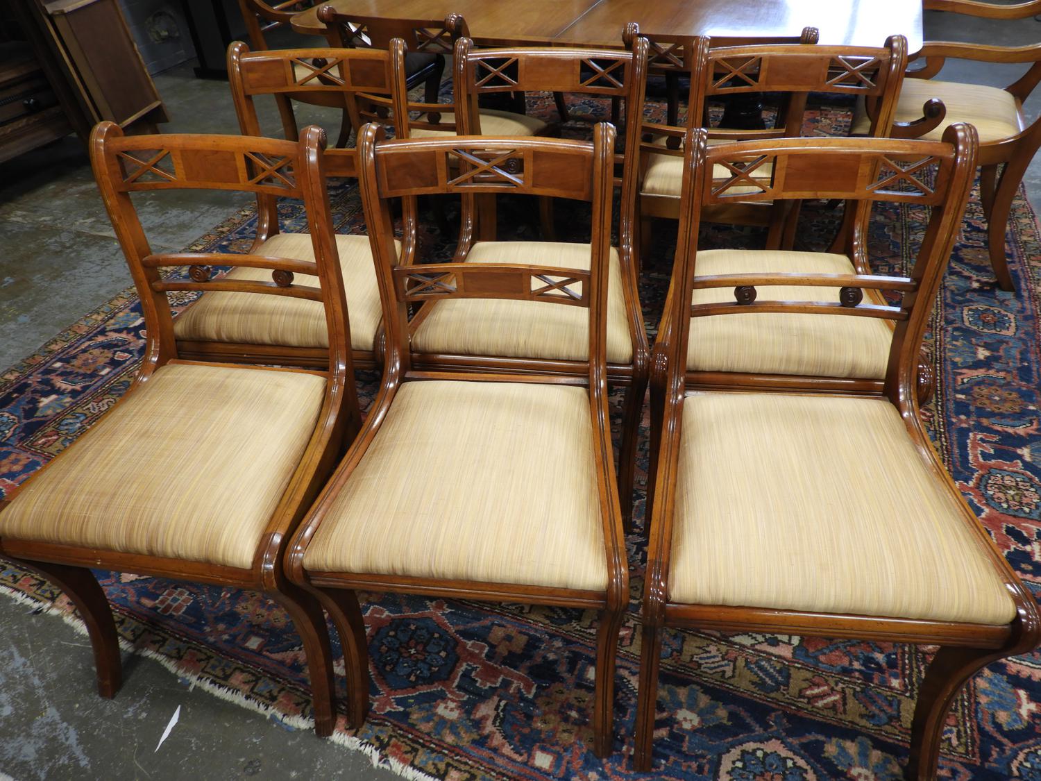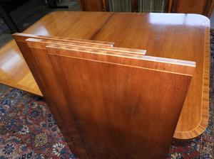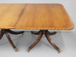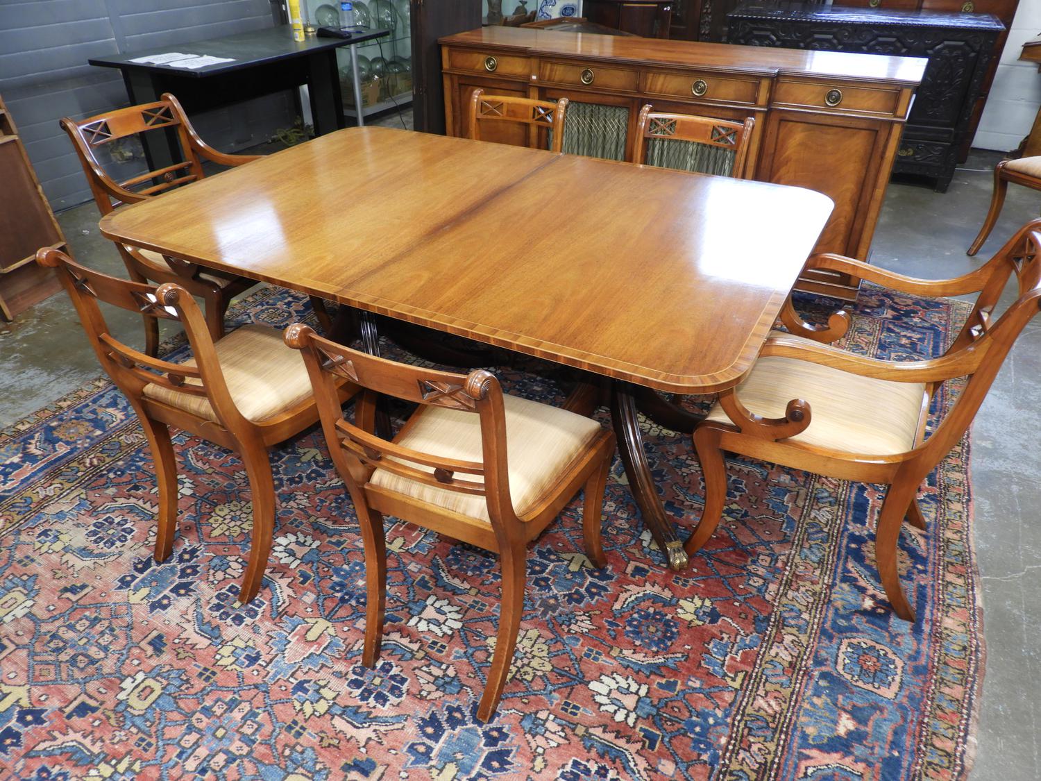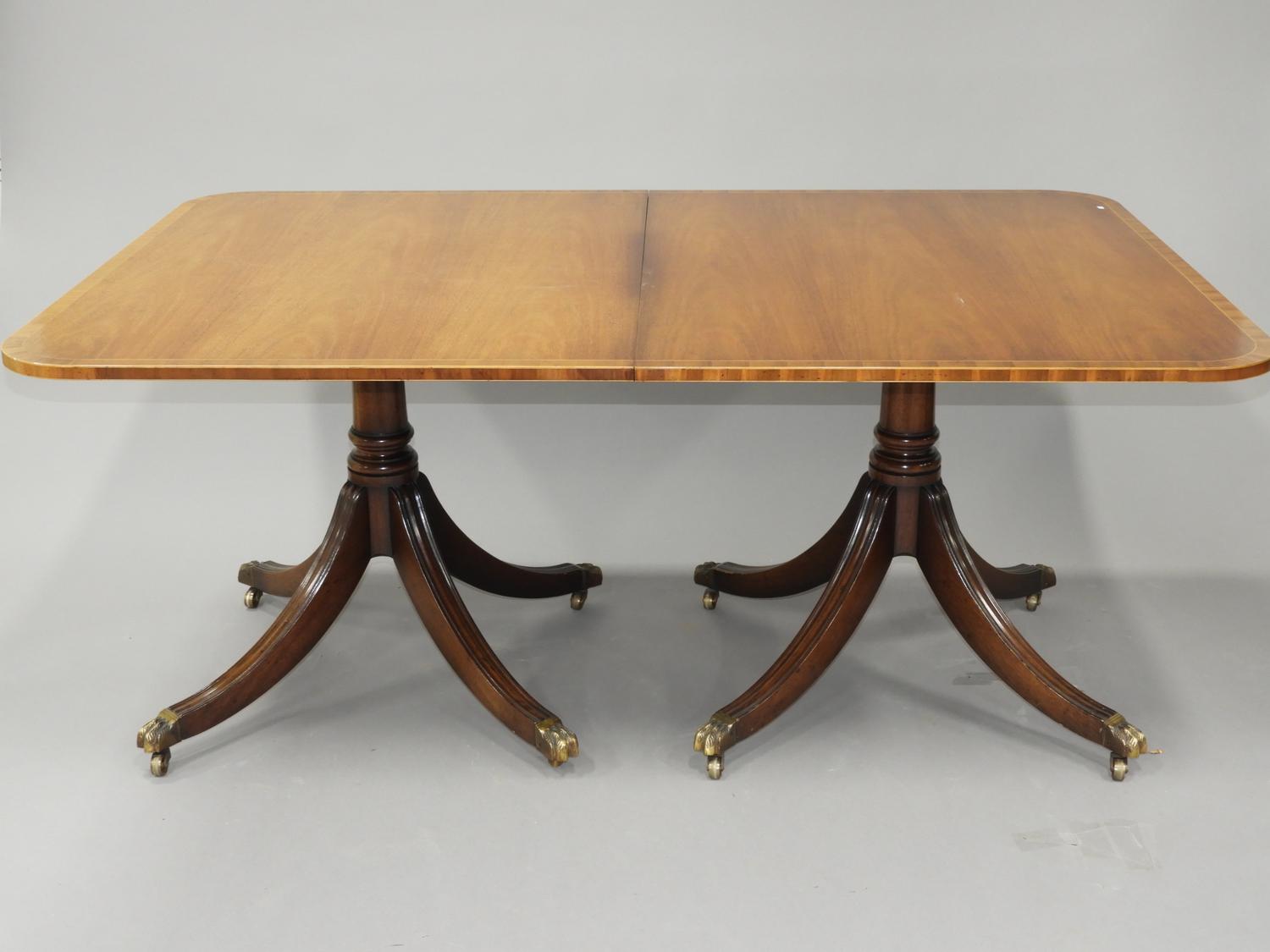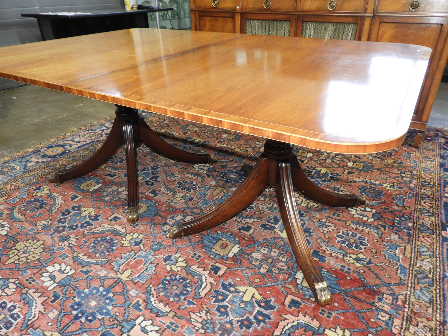 crossbanded mahogany double pedestal dining table with three leaves and twelve chairs.