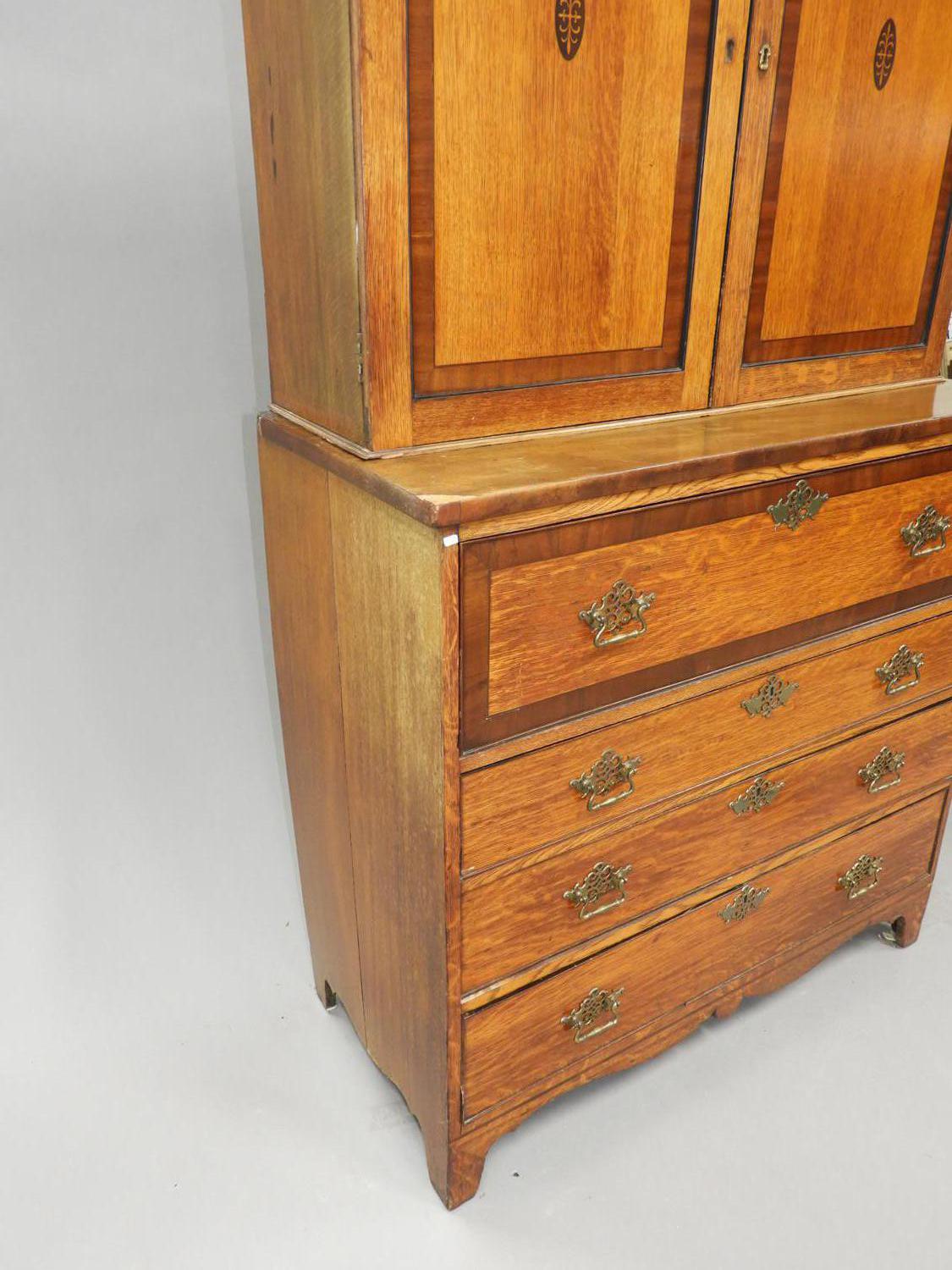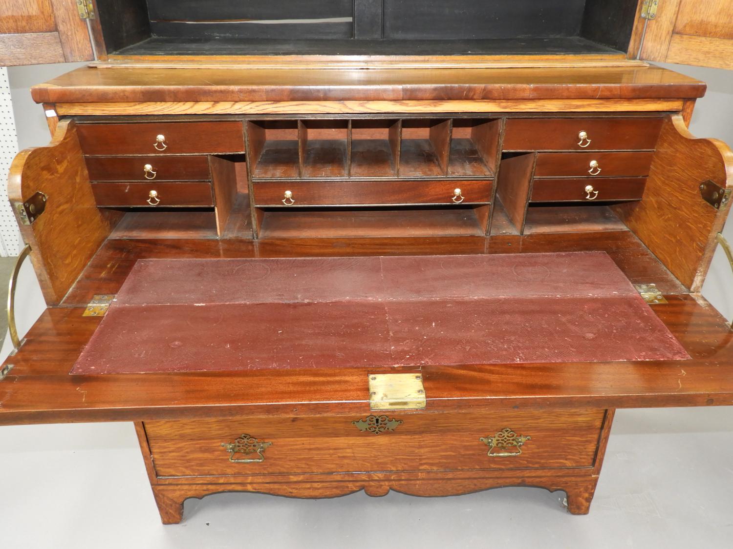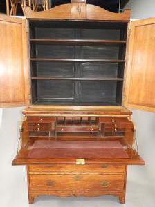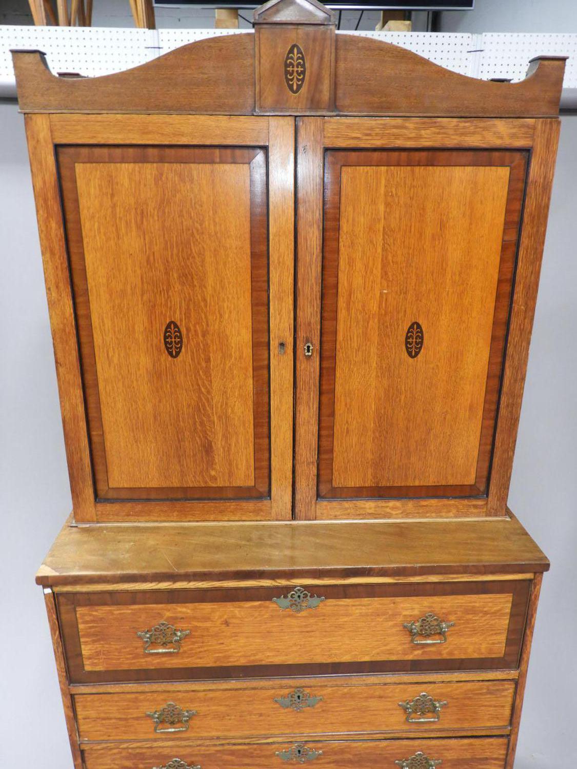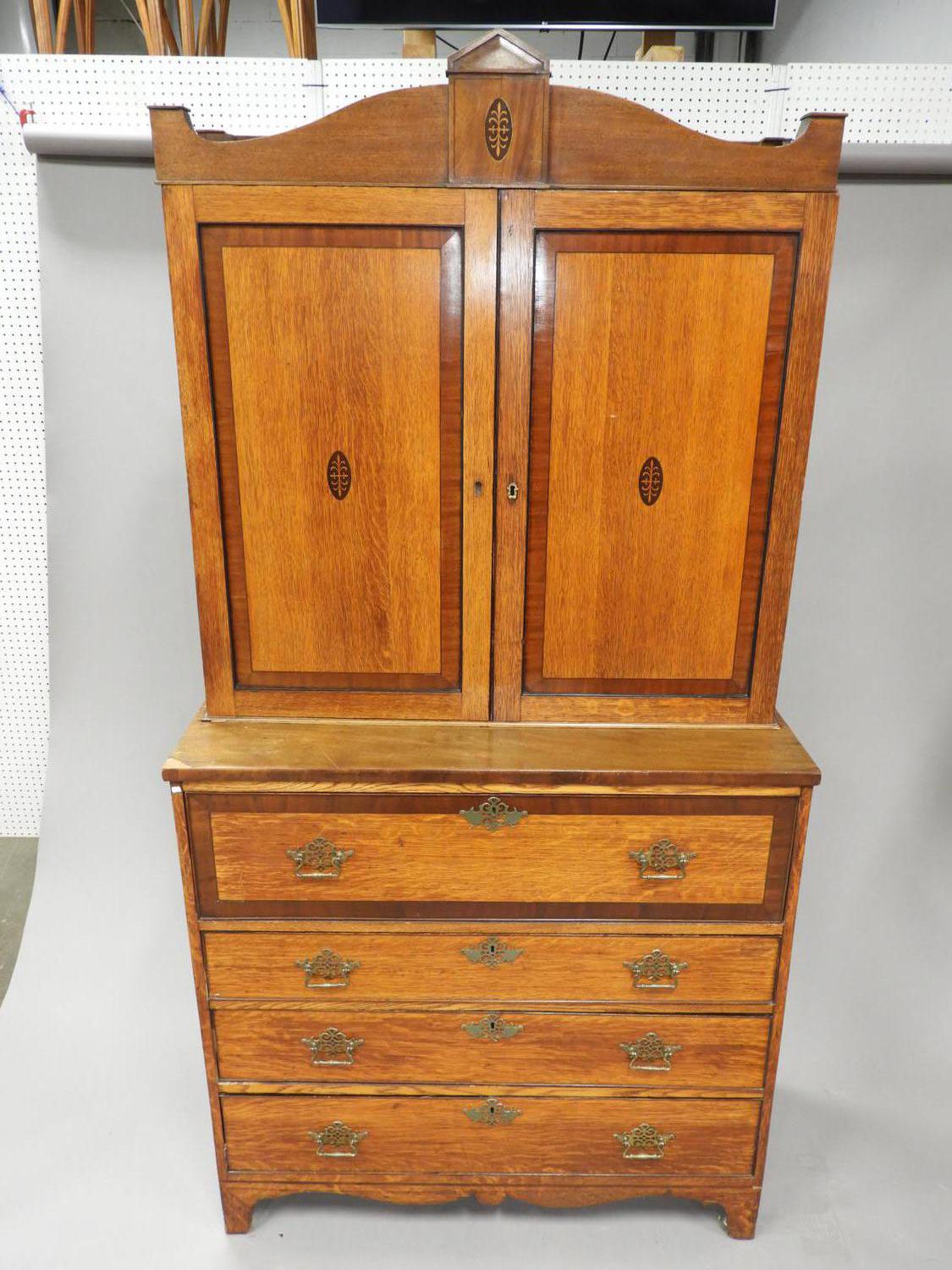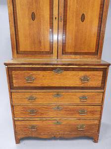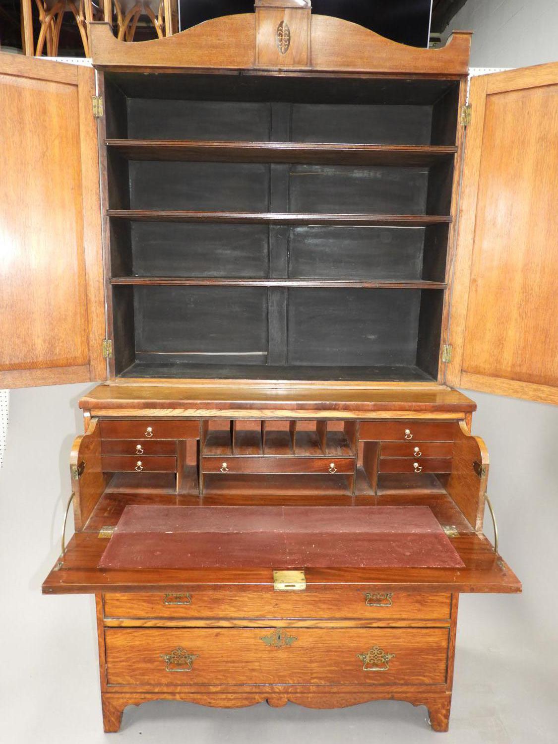 inlaid oak secretaire bookcase, 87"x 44" x 20"