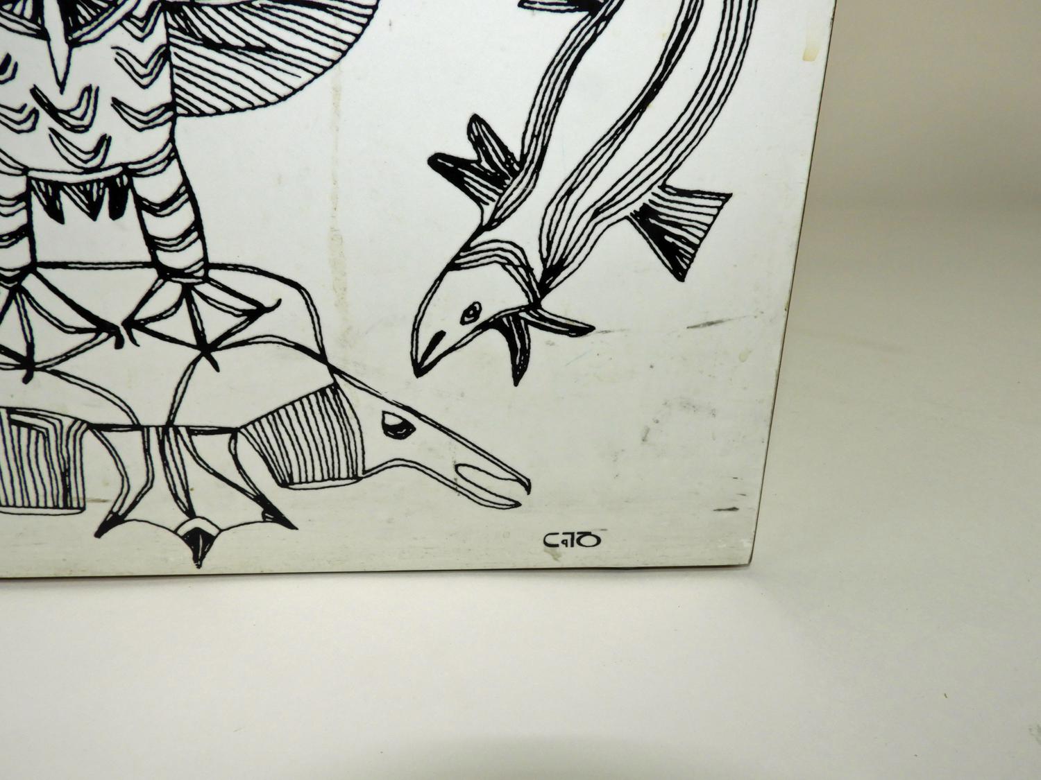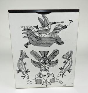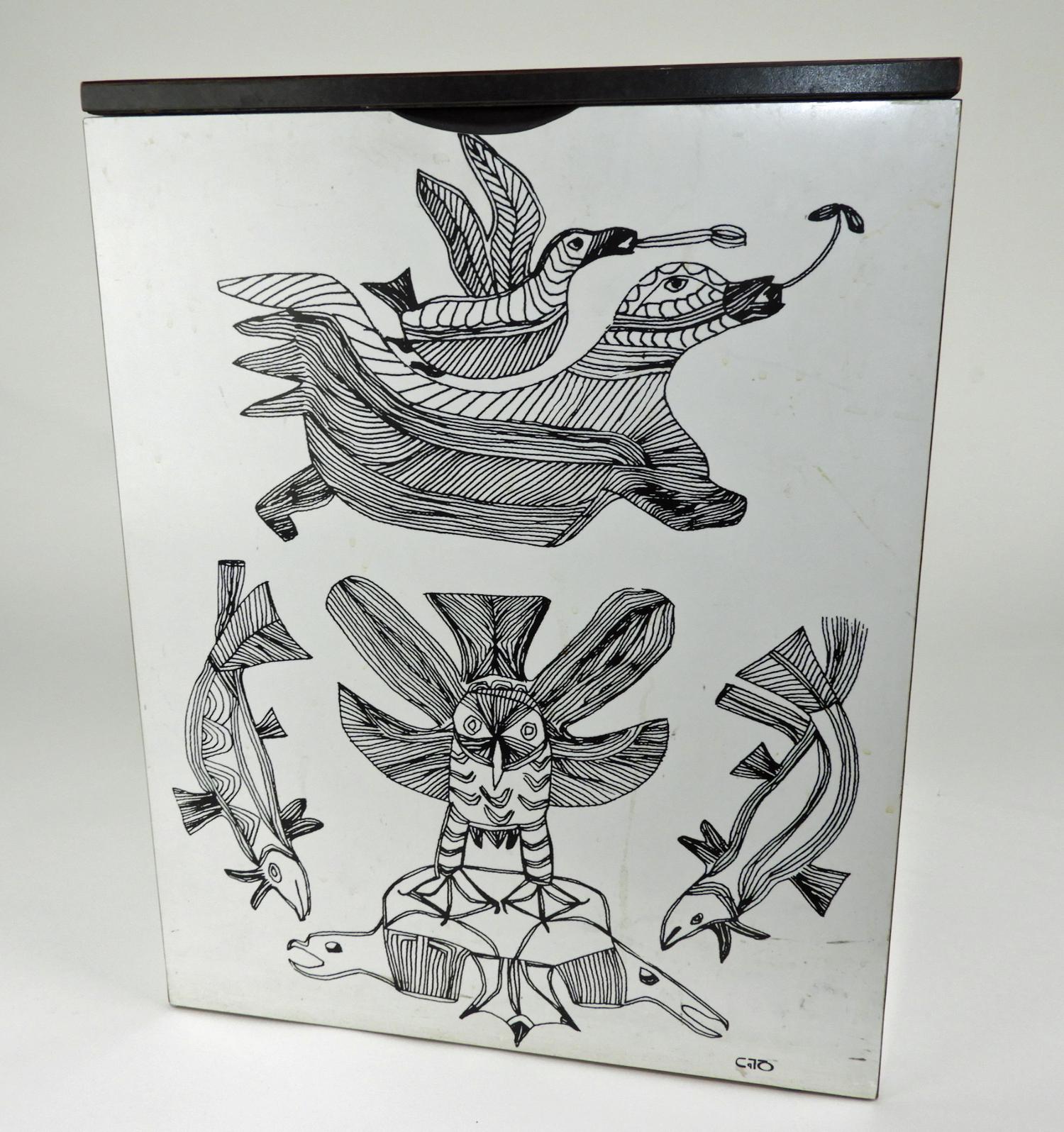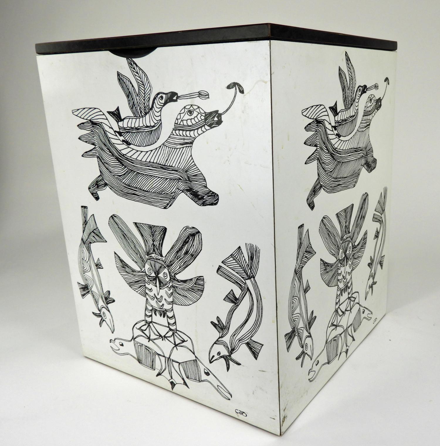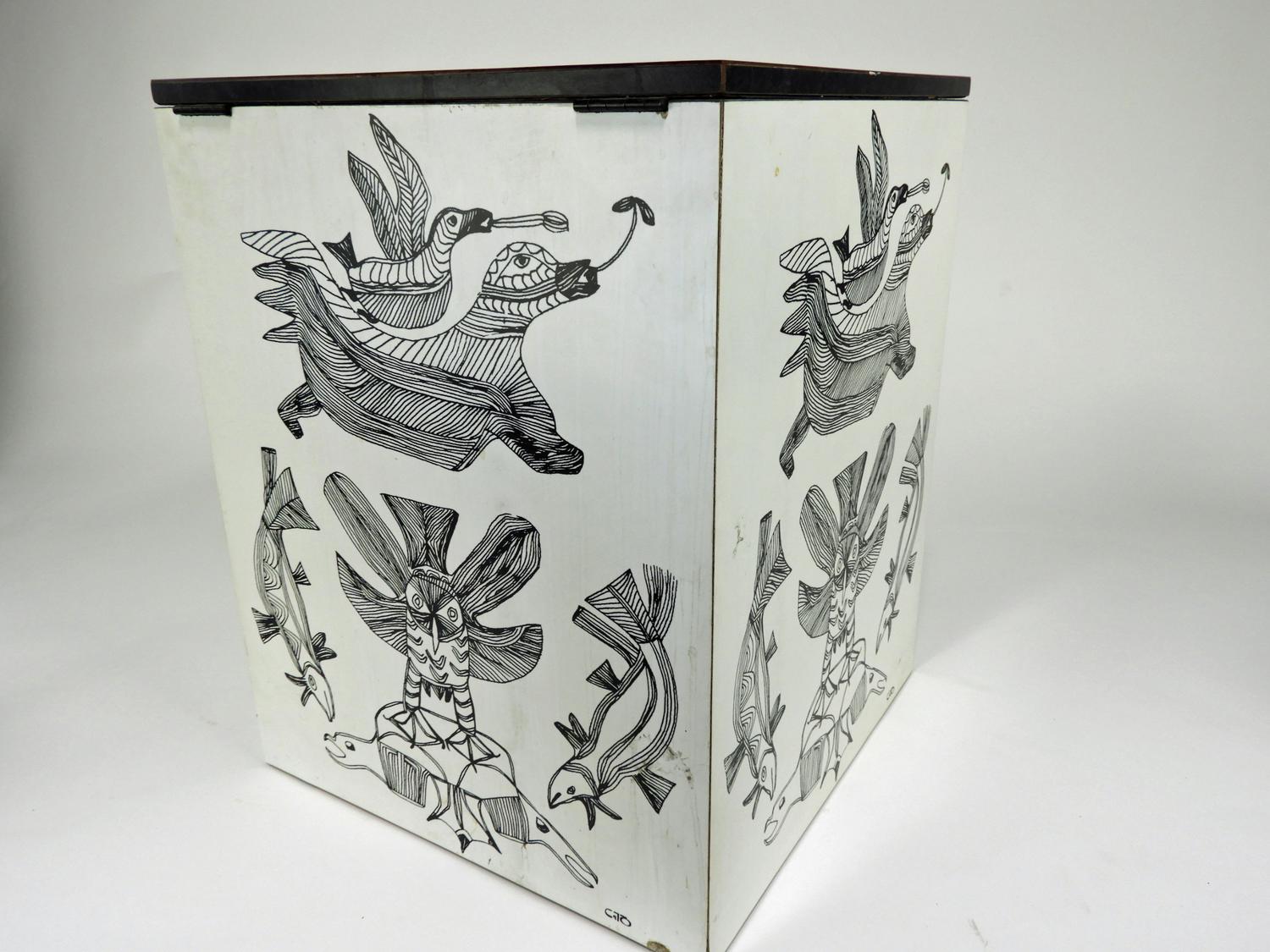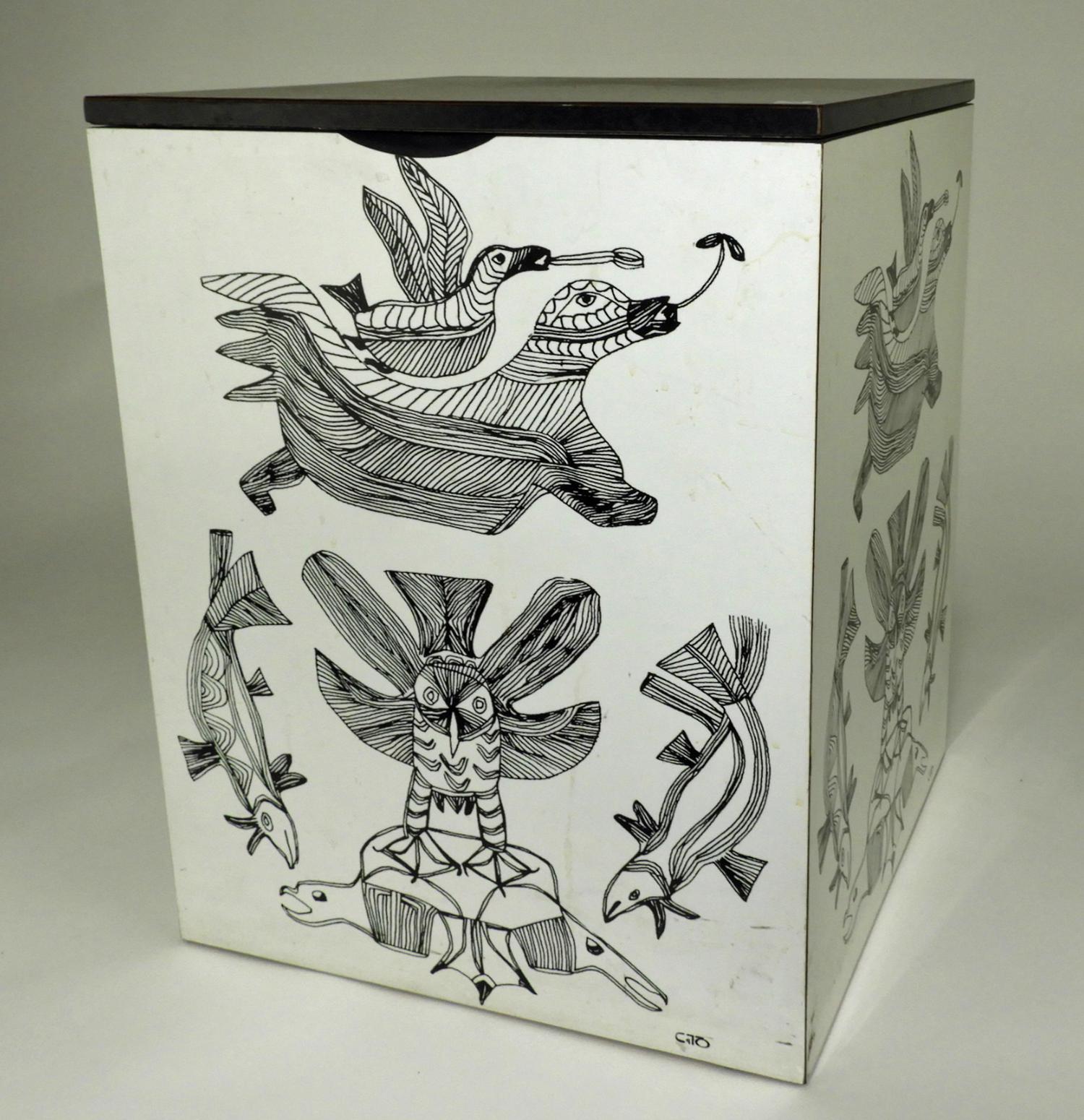 pitseolak "birds of summer" decorative box with hinged lid, 19" x 15" x 15".