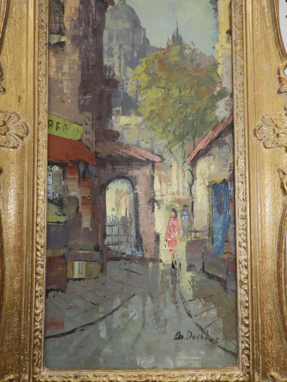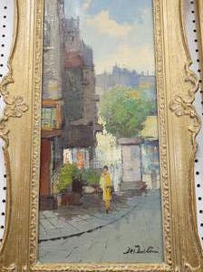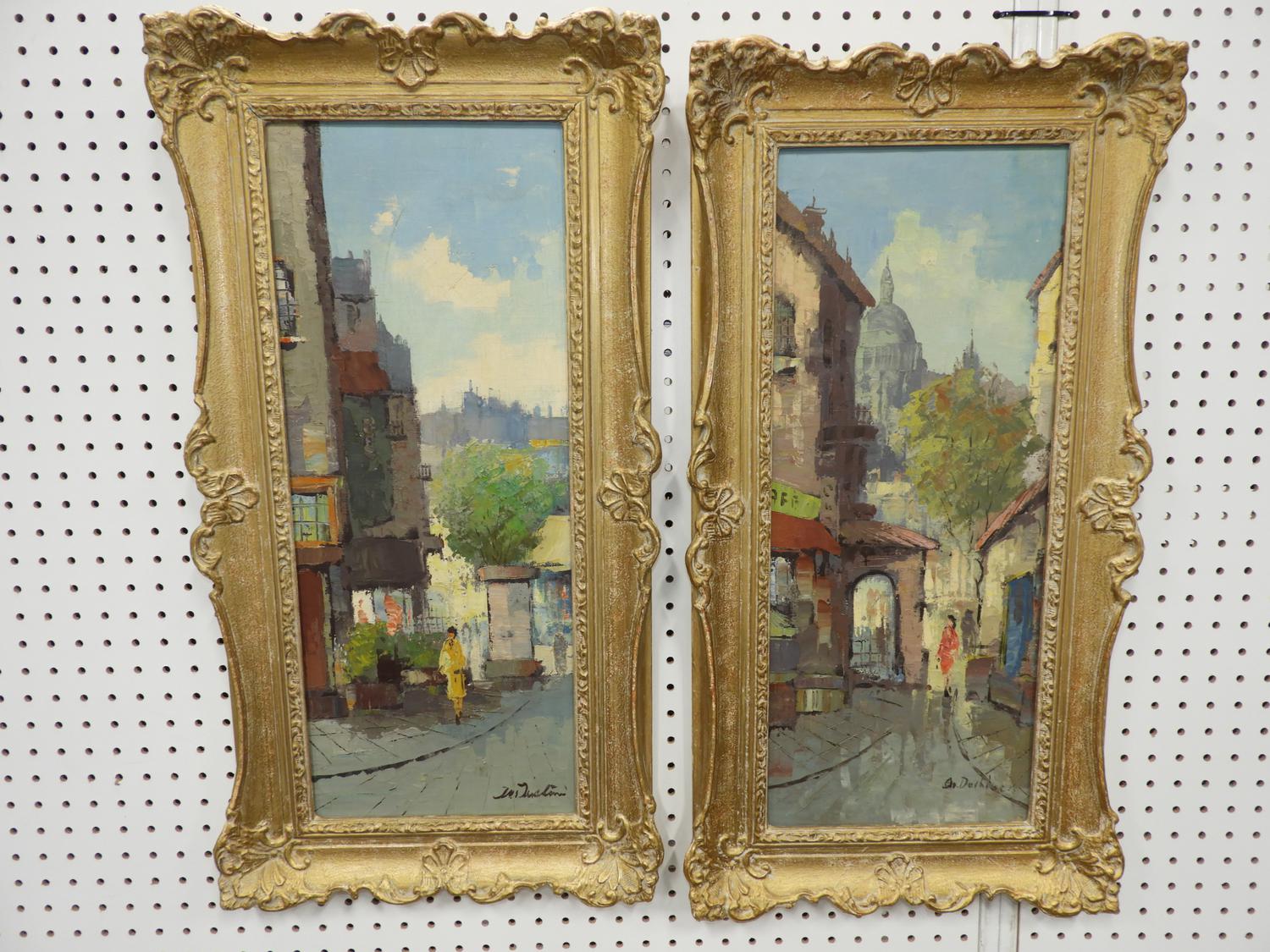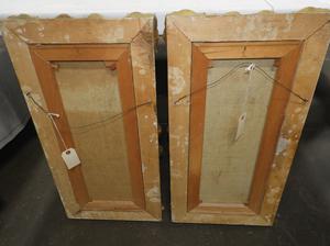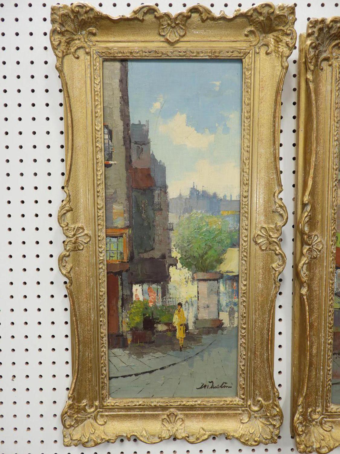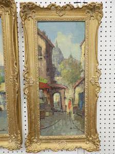 indistinctly signed pair of oils on canvas, 10" x 24", "street scene'